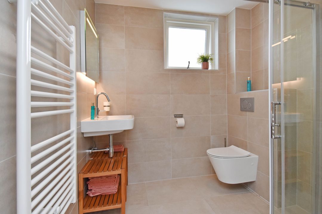 Overloop, voorzijkamer, slaapkamer aan de voorzijde, slaapkamer aan de achterzijde, luxe nieuwe badkamer met douchecabine, wastafel en toilet.