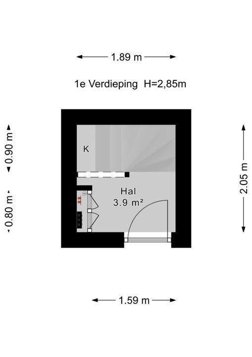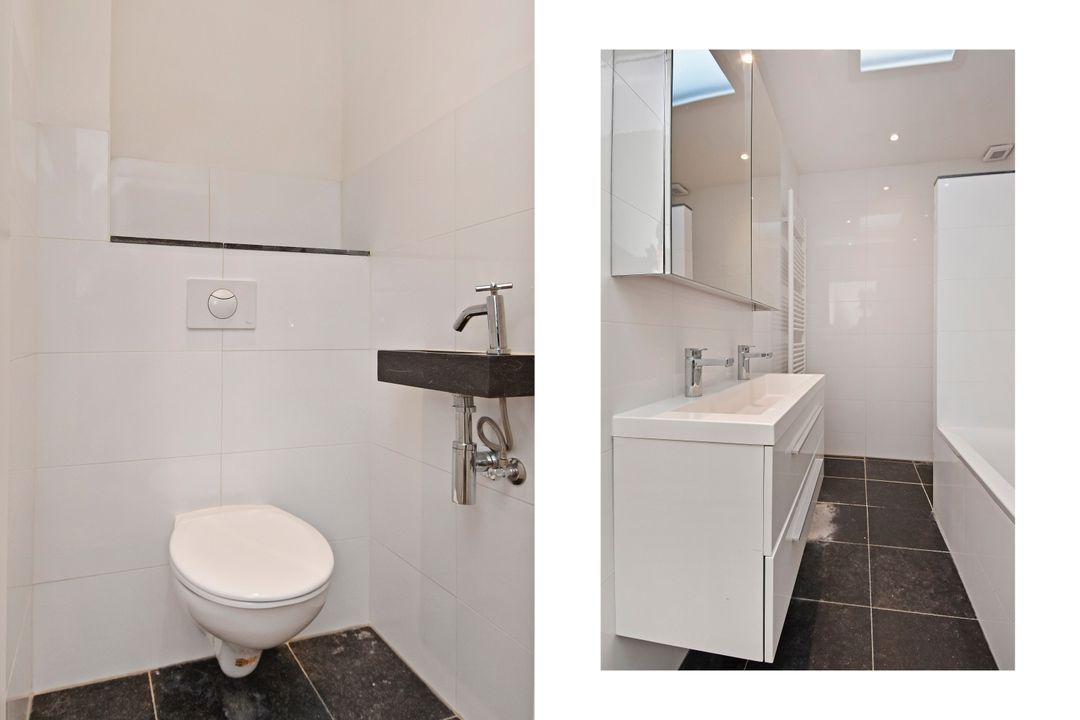 Entrance via an open porch staircase to the 1st floor, entrance of the apartment, small hall with meter cupboard, indoor stairs to the 2nd floor, landing with a skylight, bathroom with a bathtub, a showercorner, a washbasin with furniture, a design radiator and a skylight, front side bedroom, toilet room with a wall closet and a sink, living-/ dining room with an open kitchen at the rear with an L-shaped kitchenblock with a stainless steel sink, a dishwasher, a stainless steel cooking unit with a oven and a stainless steel air extractor, a separate block with a freezer, a refrigerator and a stainless steel front microwave, continues of the landing, indoor storage space with the location of the central heating boiler (AWB 20212), rear bedroom (formerly the kitchen area) with access to the balcony, rear bedroom with patio doors to the balcony.