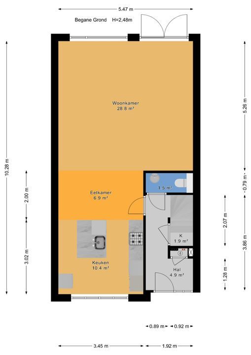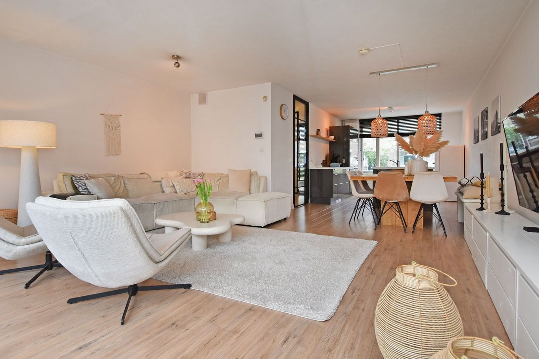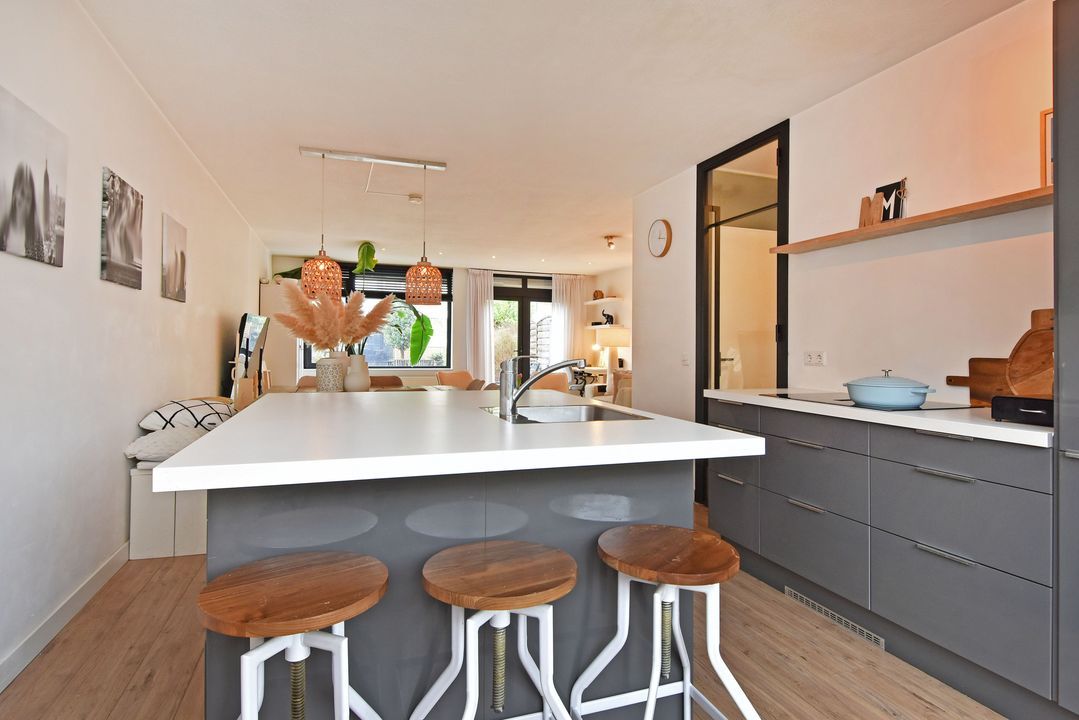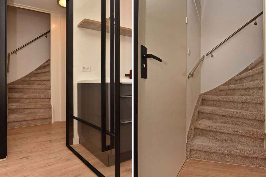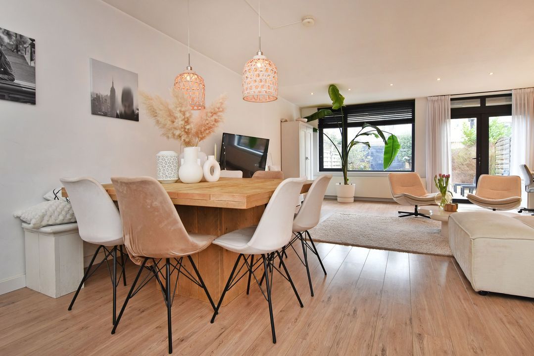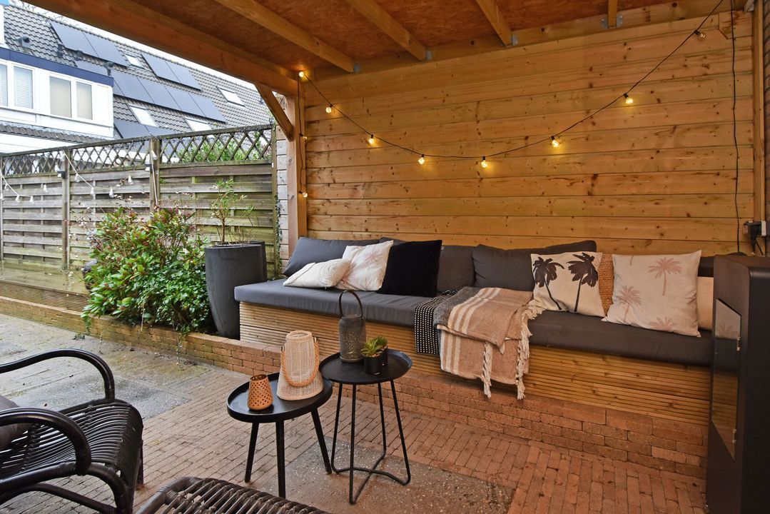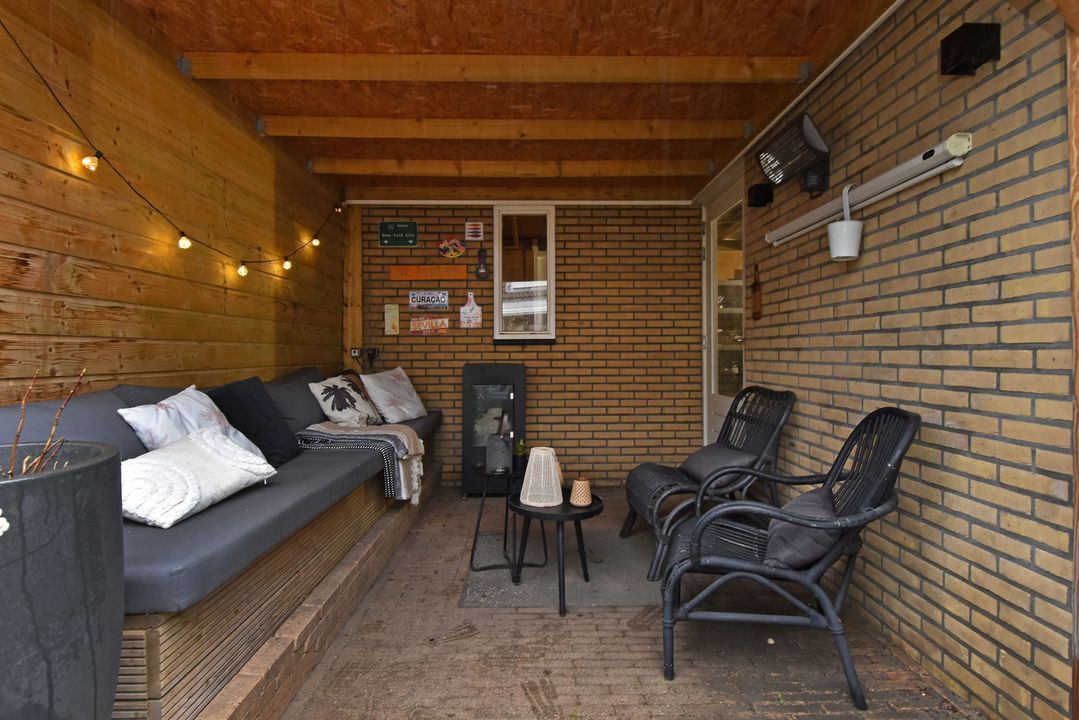 Voortuin, entree van de woning via hal met meterkast en trapkast, toiletruimte met fonteintje, uitgebouwde woon-/eetkamer met open keuken voorzien van alle gangbare inbouwapparatuur, riante achtertuin met vergrote stenen berging, veranda en achterom.