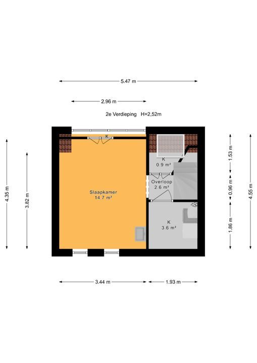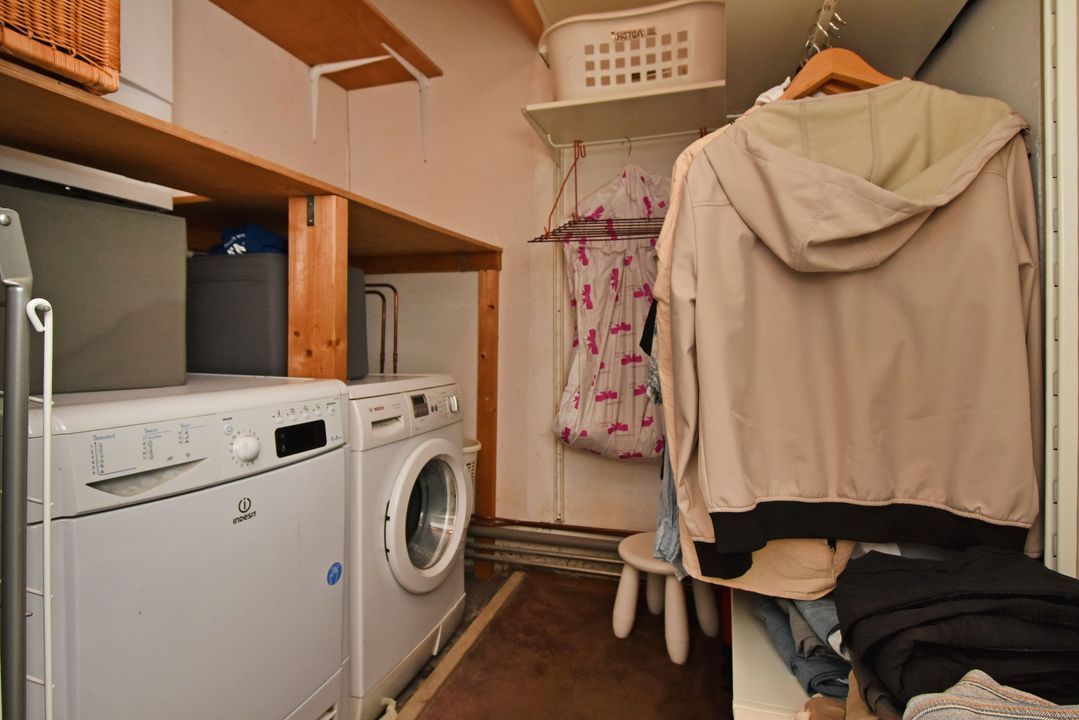 Tweede etage: overloop met bergkast, berging met wasmachineaansluiting en cv-ketel, ruime slaapkamer met dakkapel en wastafel.