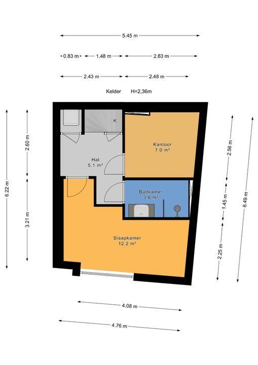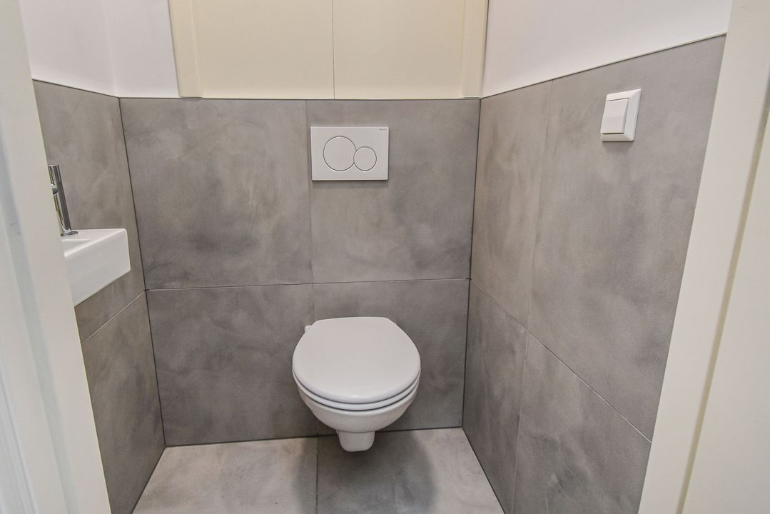 Access via a communal entrance with the fixed cupboards for the meters for gas, water and electricity, entrance of the apartment, toilet room with a wall closet and a sink as well as the location of the central heating kettle, living room with an open kitchen with an induction hob, a stainless steel recirculation extracter hood, a stainless steel sink, an oven and a fridge-/freezer, access to the patio. The basement is accessible from the living room via a staircase. In the basement there is a closet with the connection for the washing machine, a bedroom/study with space under the stairs and a cuckoo with a plastic window frame, a bedroom at the front with two cuckoos and a pump for the drain to the (main) sewer and an indoor luxury bathroom with a walk-in shower, a washbasin with furniture and an electric design radiator.