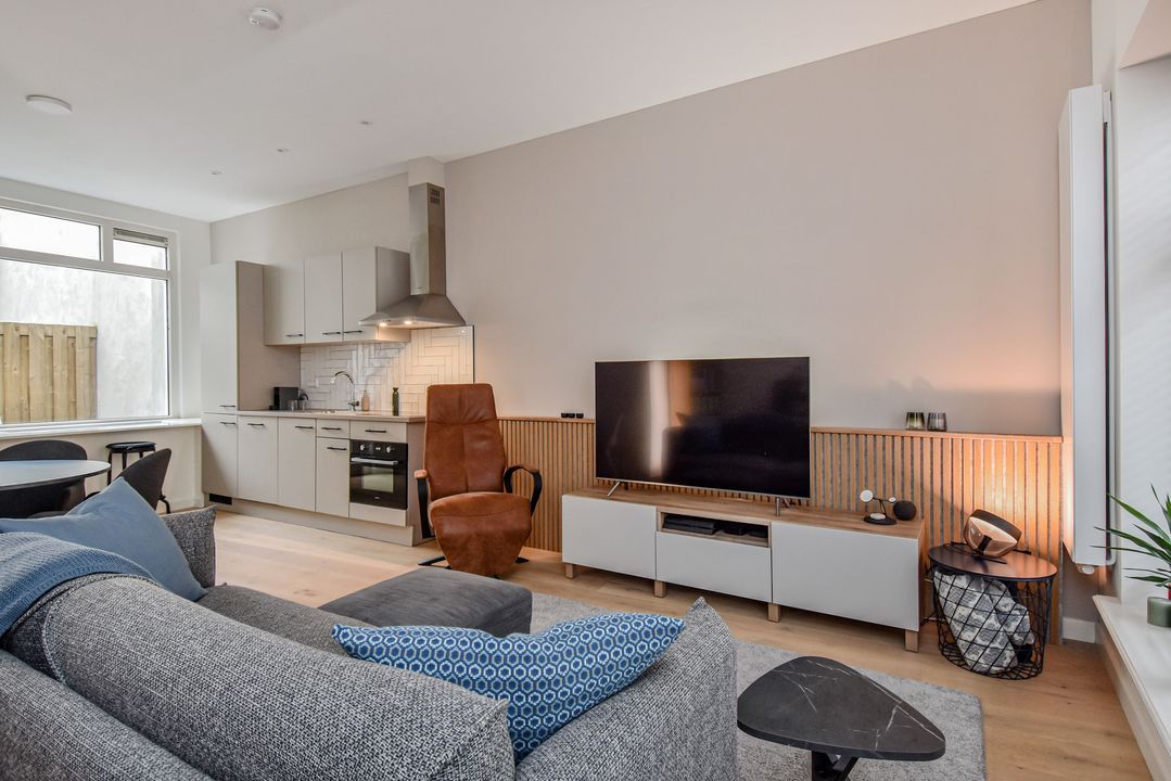 Toegang via een gemeenschappelijke entree met de vaste kasten ten behoeve van de meters voor gas- en elektra, entree van het appartement, toiletruimte met een wandcloset en een fonteintje alsmede de opstelplaats van de cv-ketel, woonkamer met een open keuken voorzien van een inductie kookplaat, een rvs-recirculatie kookplaat, een rvs-spoelbak, een oven alsmede een koel-/vries combinatie, toegang naar de patio. Vanuit de woonkamer is middels een vaste trap het souterrain bereikbaar. In het souterrain is er een vaste kast met de aansluiting voor de wasmachine, een slaap/werkkamer met ruimte onder de trap en een koekoek met een kunststof raam, een slaapkamer aan de voorzijde met 2x een koekoek en een pomp tbv de afvoer naar het (hoofd)riool en een inpandige luxe badkamer met een inloopdouche, een vaste wastafel met meubel en een elektrische design radiator.