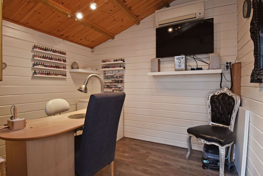 * chalet in achtertuin deels voorzien van airco en verwarming, en mogelijkheid voor aansluiting waterleiding