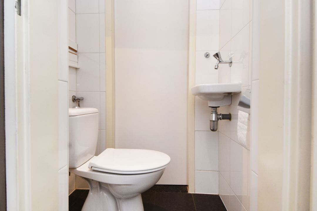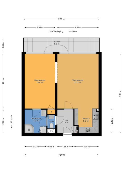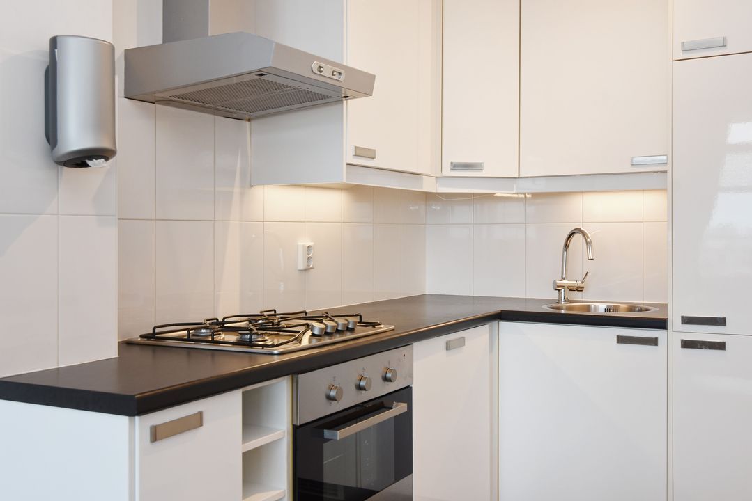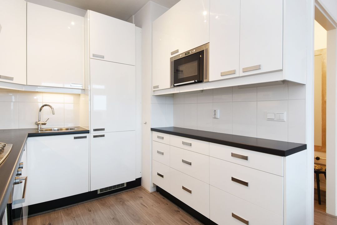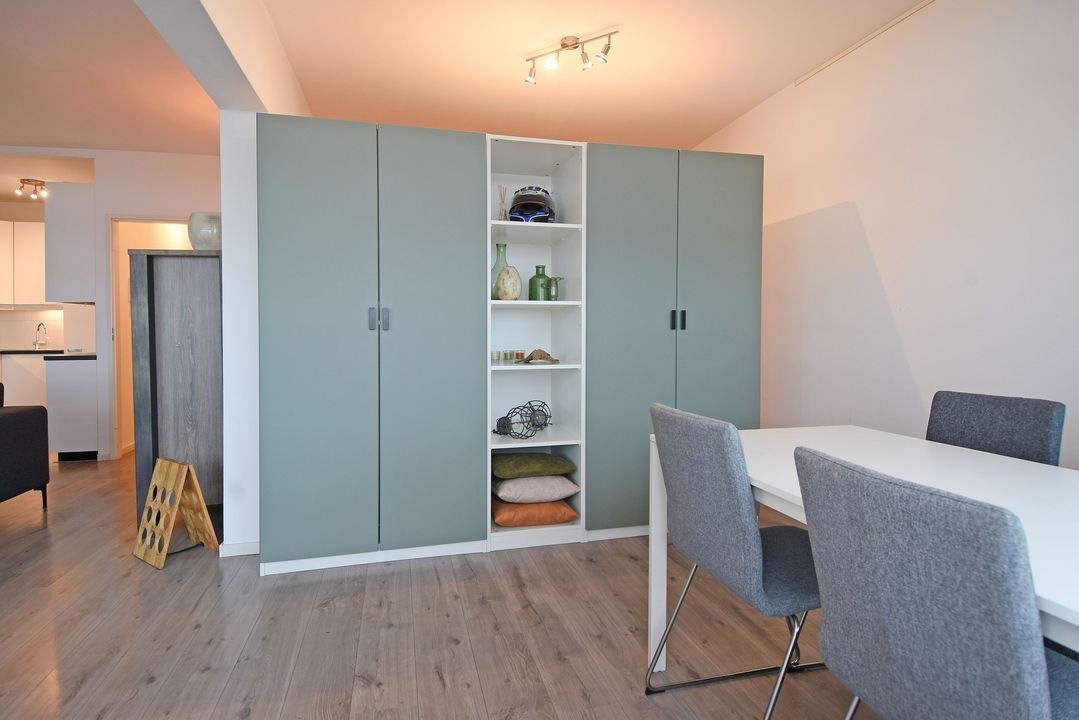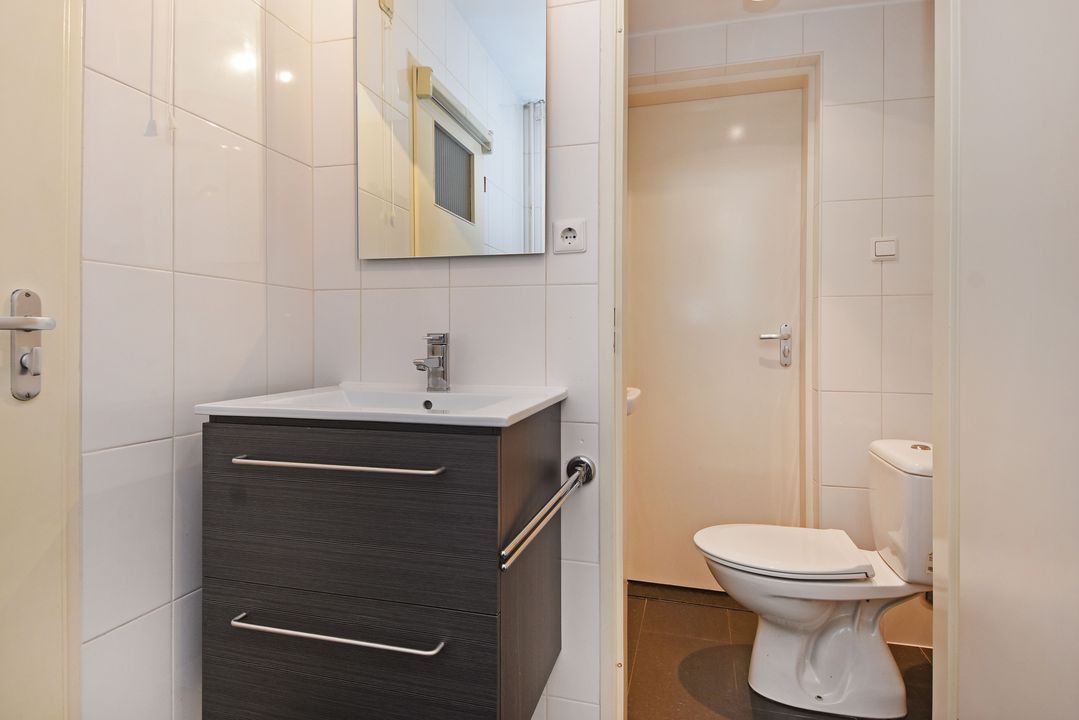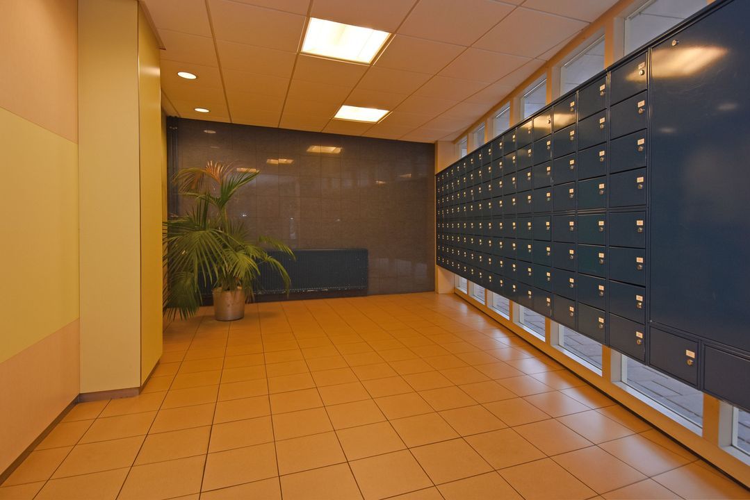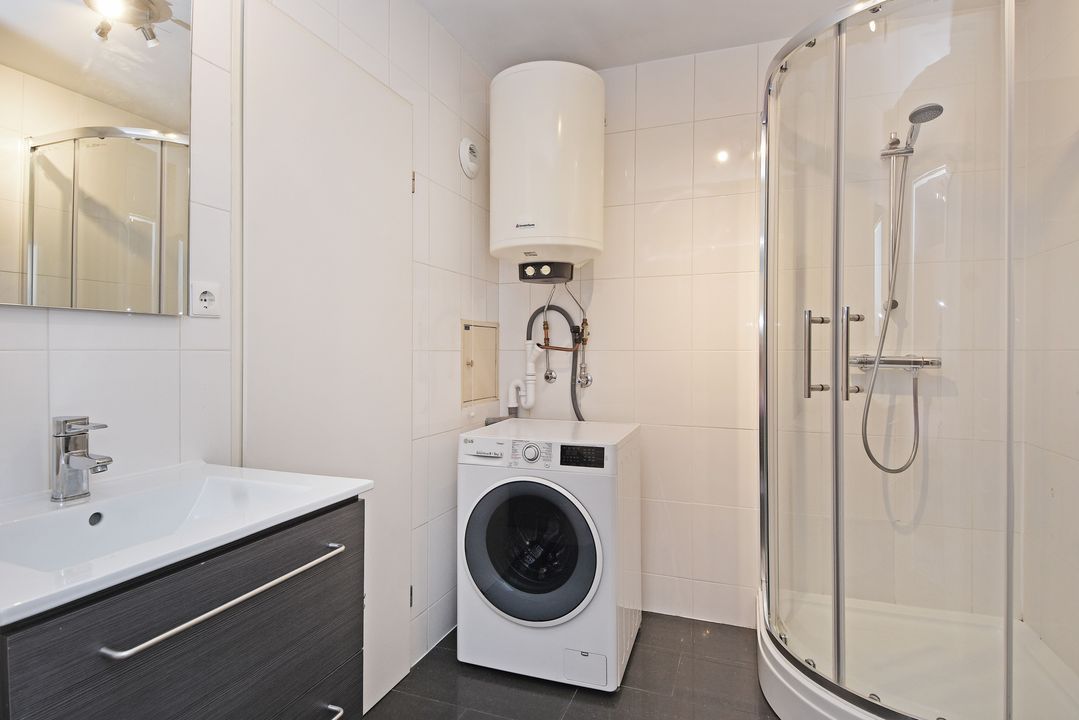 Entrance through a closed porch with mailboxes and videophone installation, elevator or staircase to the 11th floor, corridor to the apartment, entrance of the apartment, hall/corridor, meter cupboard, toilet room with a duo block and a sink (and passage to bathroom), living room with open kitchen with a neat interior and equipped with a stainless steel gas hob, an extractor hood, a stainless steel sink, a fridge freezer, a dishwasher and a narrow extra worktop with cupboard space and a microwave, from the living room access to the balcony and access via the dining area, separated by cupboard space to the bedroom area with a closet and also access to the indoor bathroom with a shower cabin, a washbasin with furniture, the connection for the washing machine and the location of the rental boiler. On the 11th floor there is a private storage room at the end of the corridor.