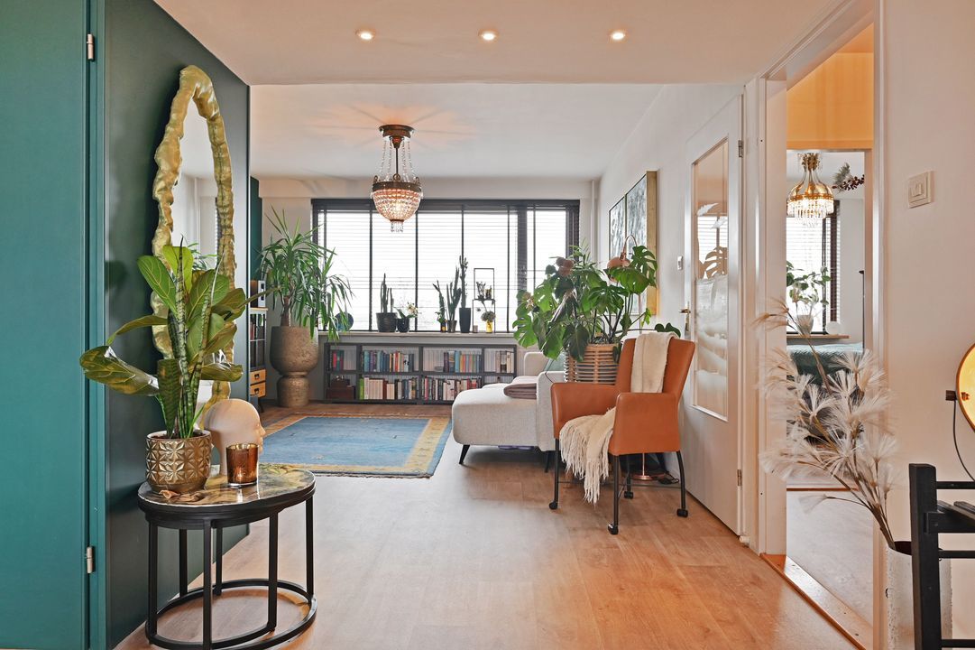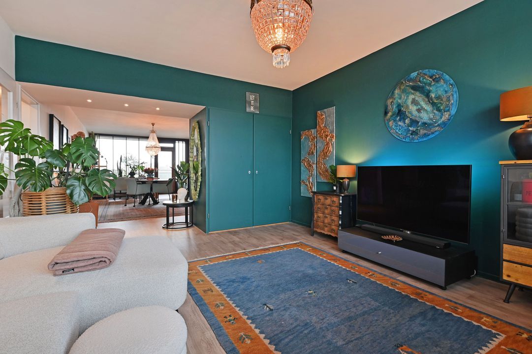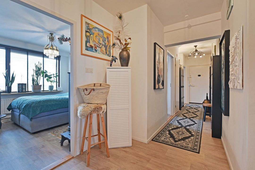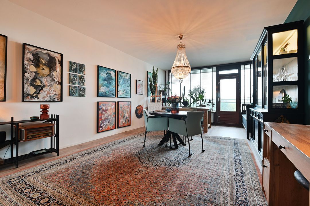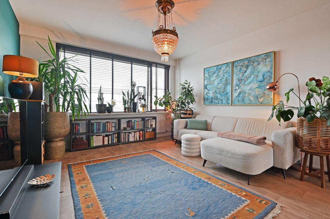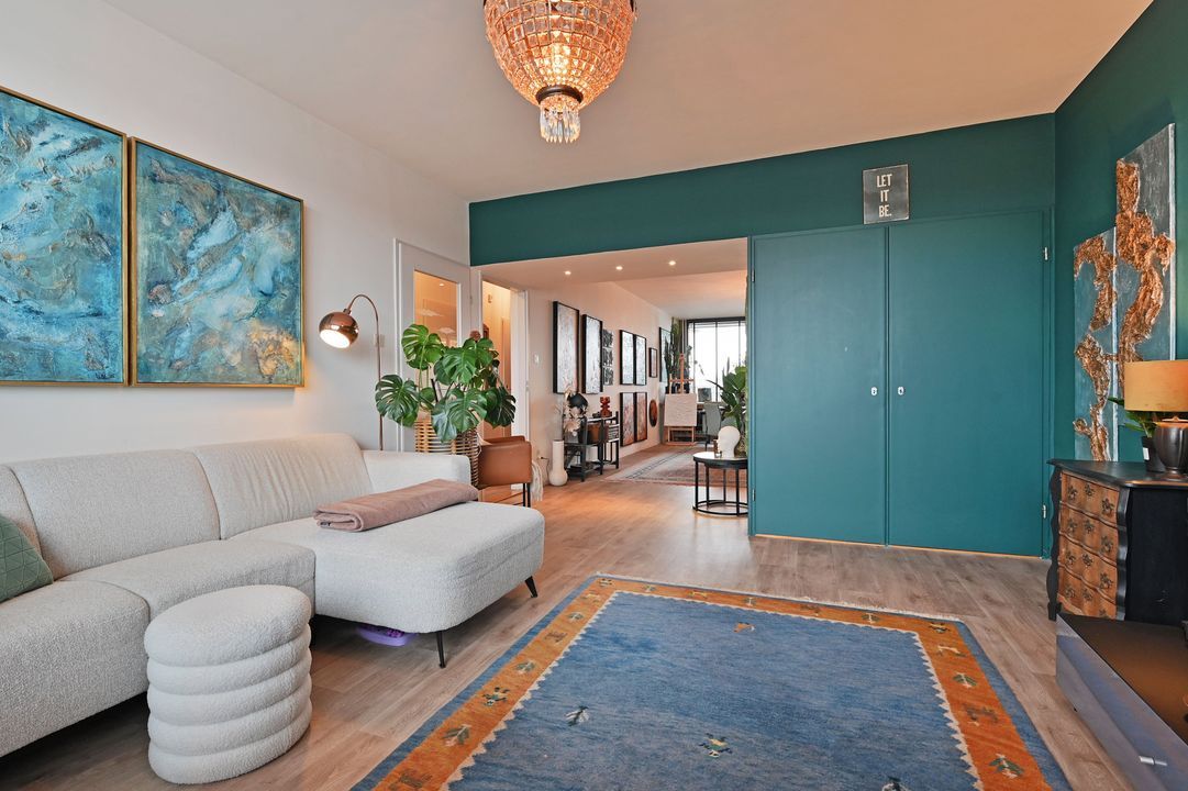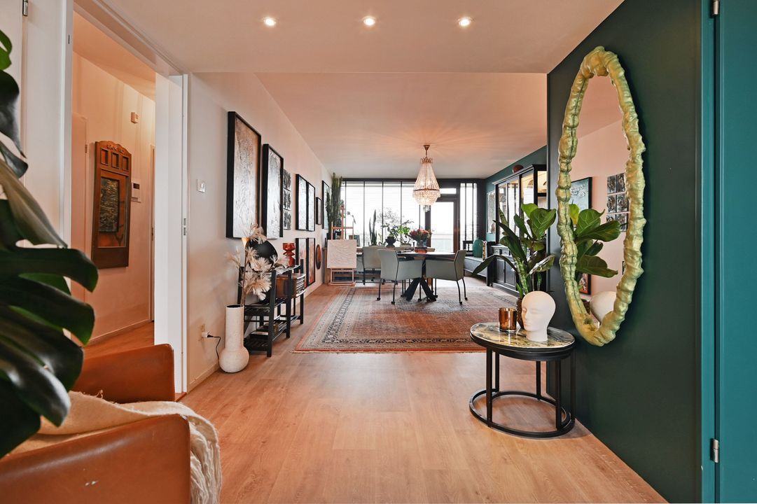 Gemeenschappelijke entree via een gesloten portiek, lift naar 6e etage, portiek, entreehal met meterkast, drie slaapkamers aan de voorzijde waarvan 2 met een vaste kast, toilet met fonteintje, badkamer met een moderne inrichting voorzien van een douche, vaste wastafel met meubel, vloerverwarming en opstelplaats boiler, ruime keuken met een luxe inrichting voorzien van diverse apparatuur waaronder een BORA inductiekookplaat met ingebouwd afzuigsysteem, een vaatwasser, een kokend waterkraan en een combimagnetron, deur naar het balkon, ruime woon-/eetkamer met toegang tot het balkon en vaste kasten.