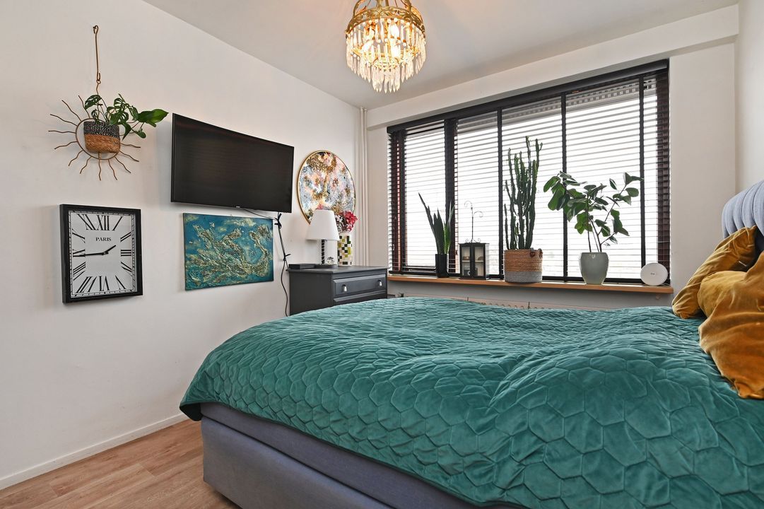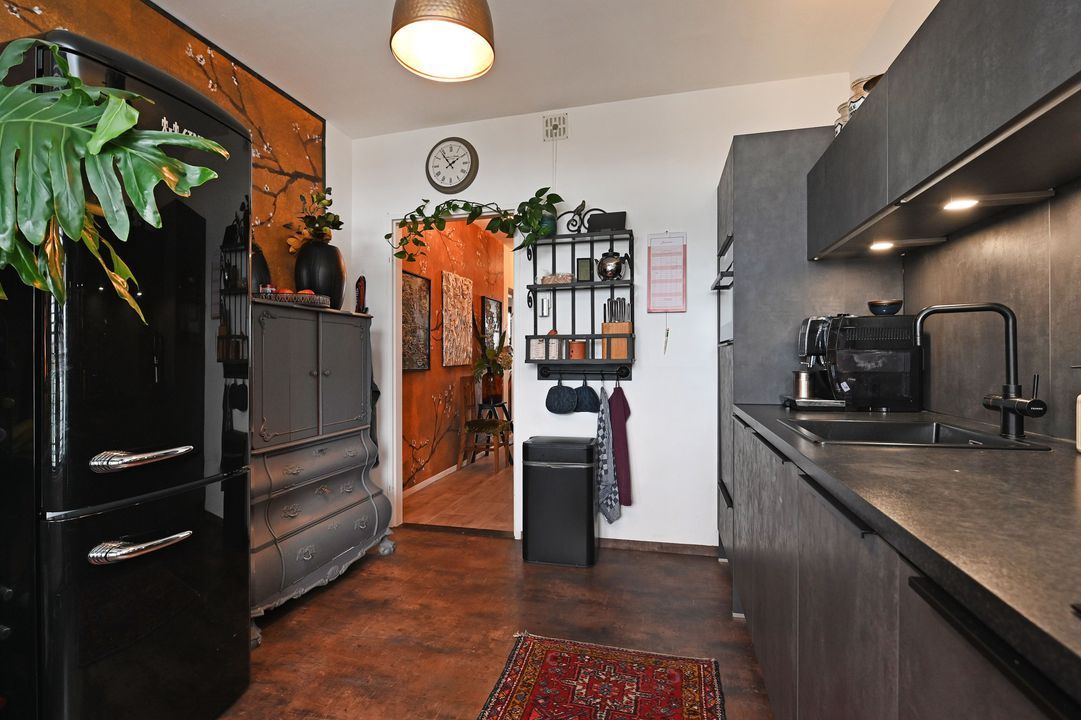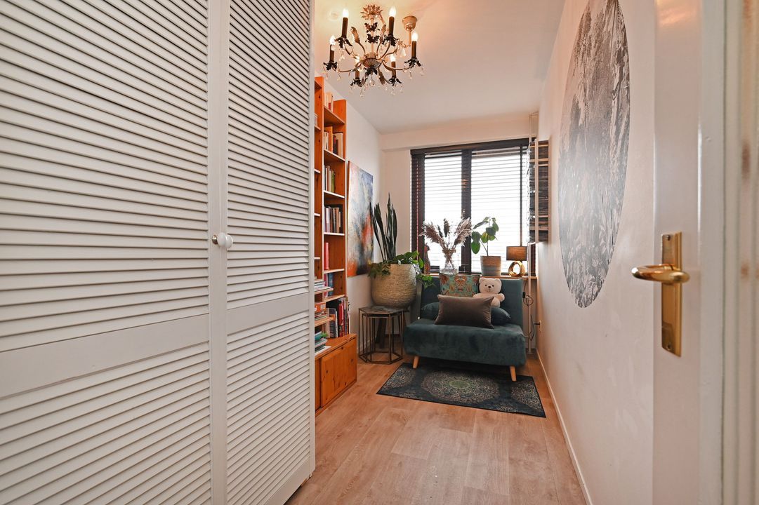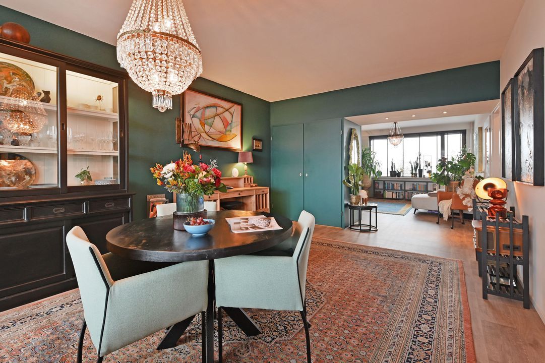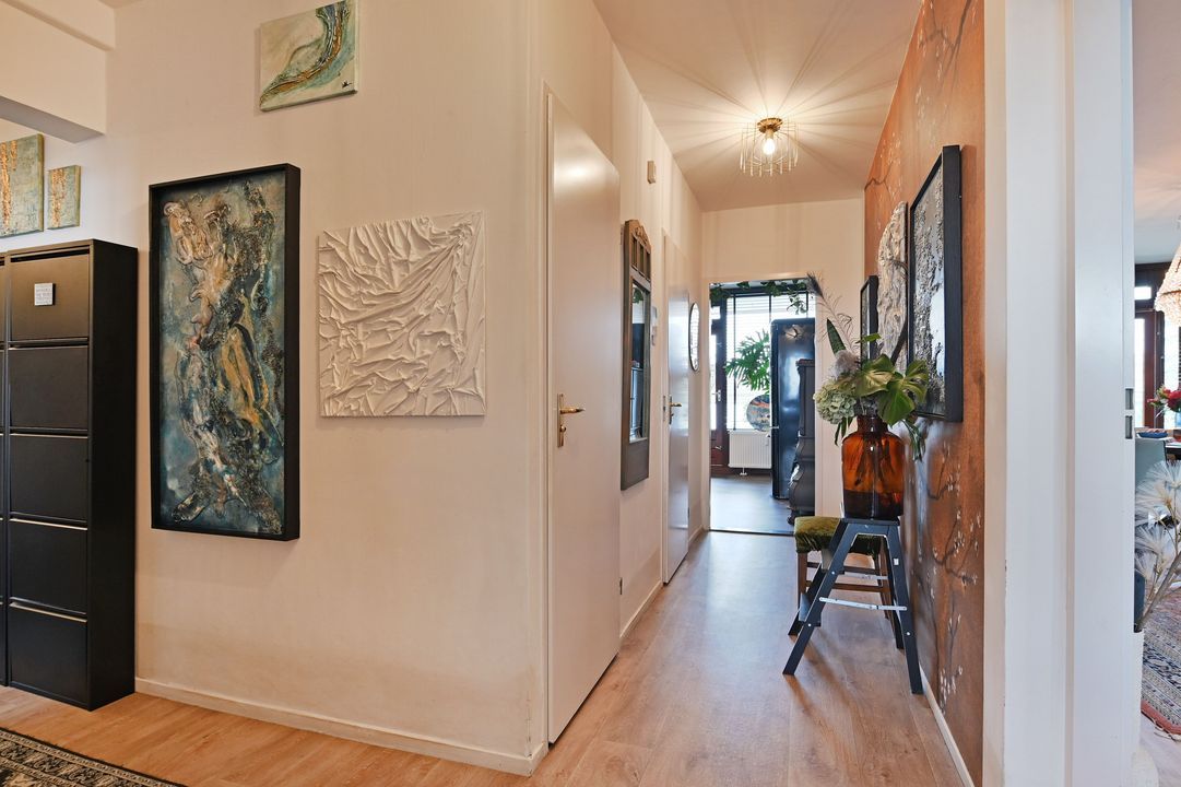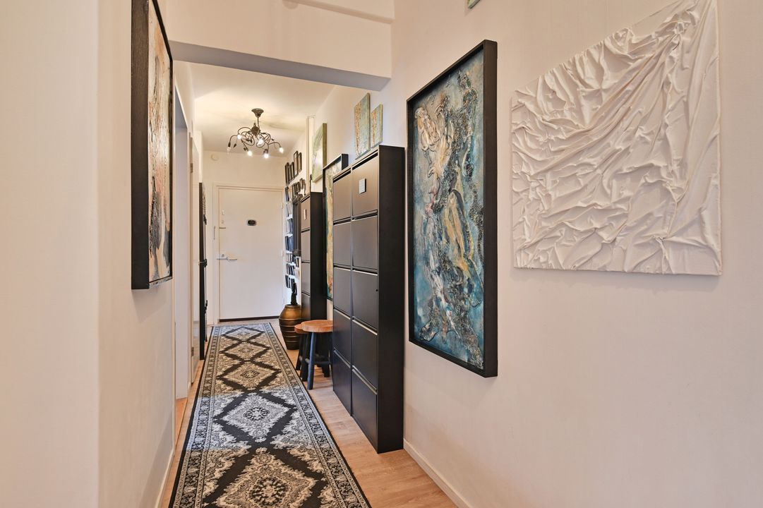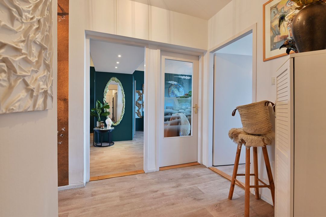 Gemeenschappelijke entree via een gesloten portiek, lift naar 6e etage, portiek, entreehal met meterkast, drie slaapkamers aan de voorzijde waarvan 2 met een vaste kast, toilet met fonteintje, badkamer met een moderne inrichting voorzien van een douche, vaste wastafel met meubel, vloerverwarming en opstelplaats boiler, ruime keuken met een luxe inrichting voorzien van diverse apparatuur waaronder een BORA inductiekookplaat met ingebouwd afzuigsysteem, een vaatwasser, een kokend waterkraan en een combimagnetron, deur naar het balkon, ruime woon-/eetkamer met toegang tot het balkon en vaste kasten.