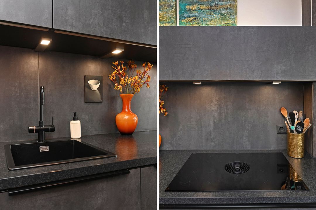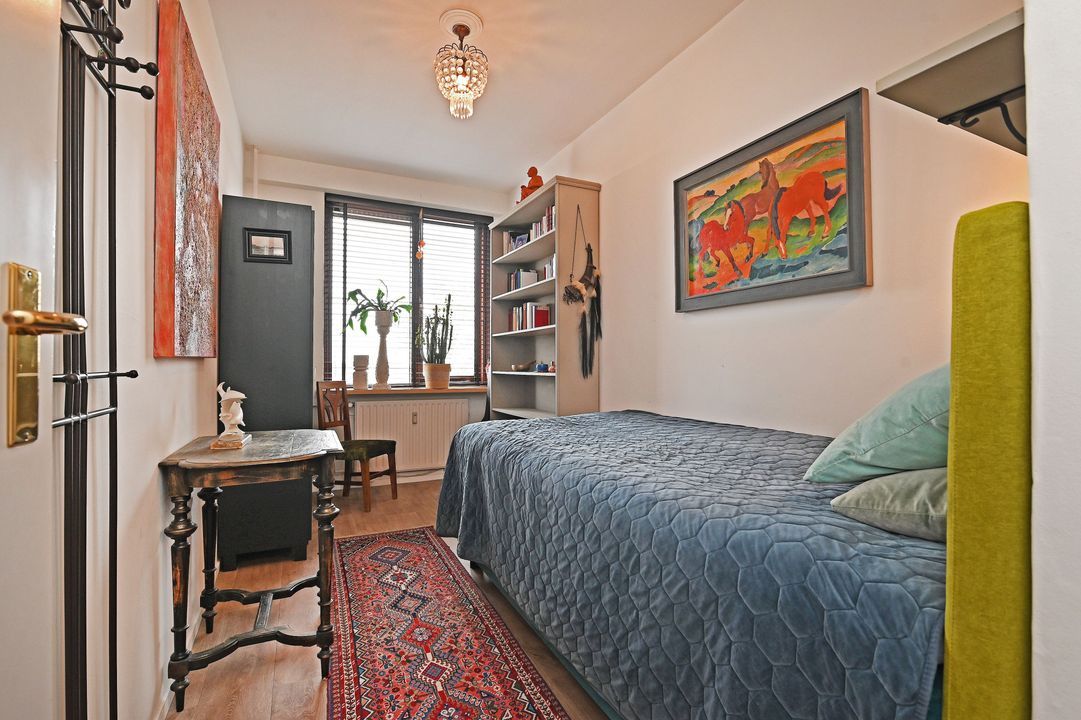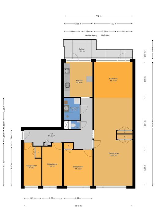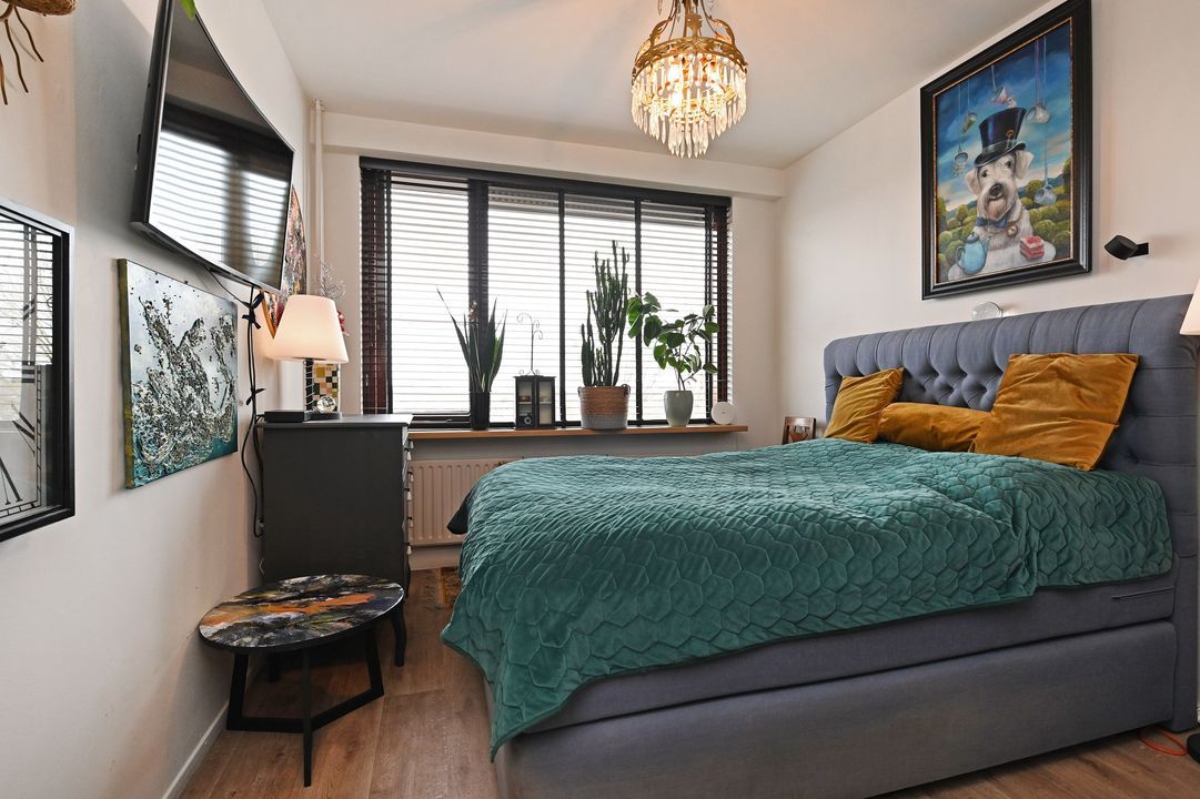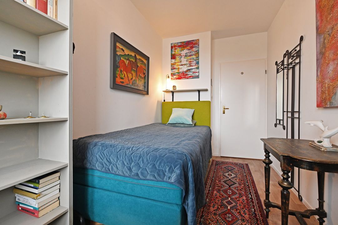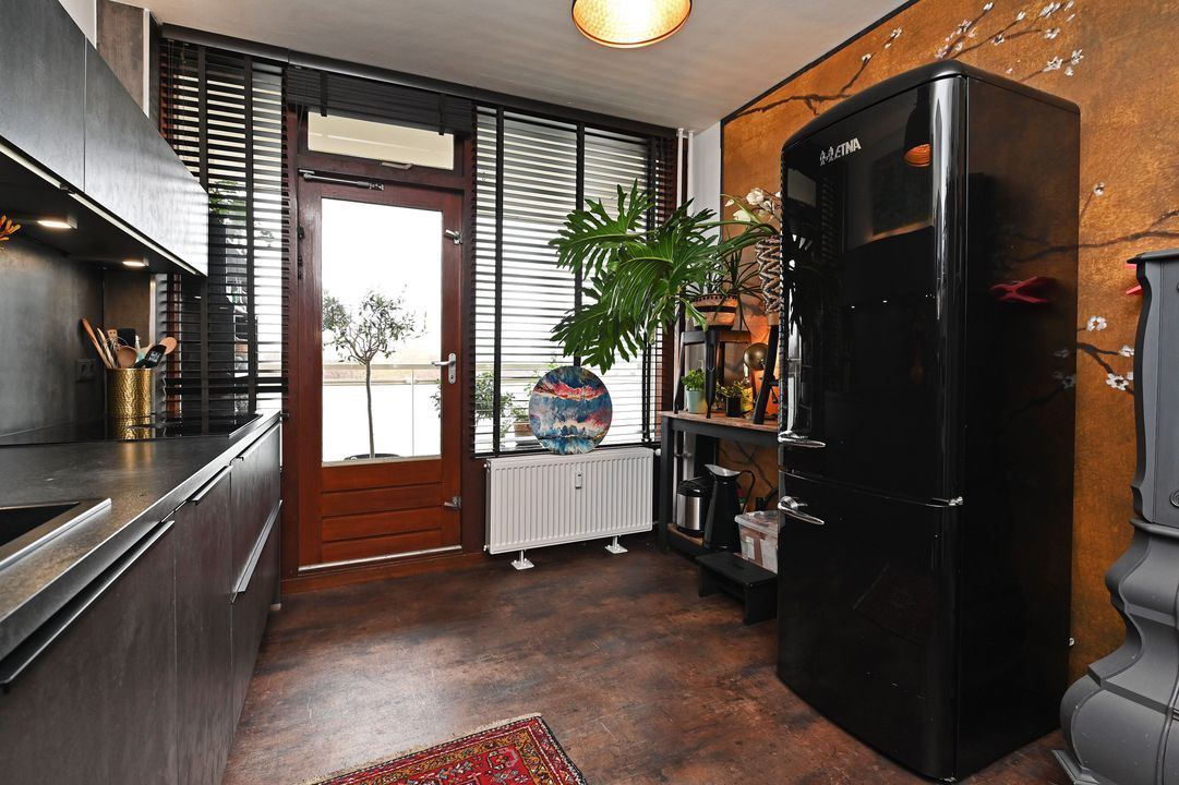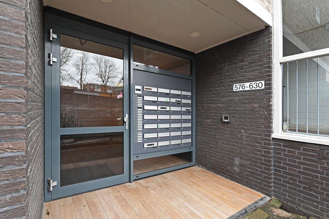 Gemeenschappelijke entree via een gesloten portiek, lift naar 6e etage, portiek, entreehal met meterkast, drie slaapkamers aan de voorzijde waarvan 2 met een vaste kast, toilet met fonteintje, badkamer met een moderne inrichting voorzien van een douche, vaste wastafel met meubel, vloerverwarming en opstelplaats boiler, ruime keuken met een luxe inrichting voorzien van diverse apparatuur waaronder een BORA inductiekookplaat met ingebouwd afzuigsysteem, een vaatwasser, een kokend waterkraan en een combimagnetron, deur naar het balkon, ruime woon-/eetkamer met toegang tot het balkon en vaste kasten.