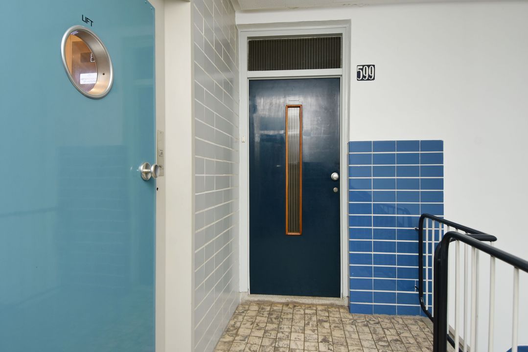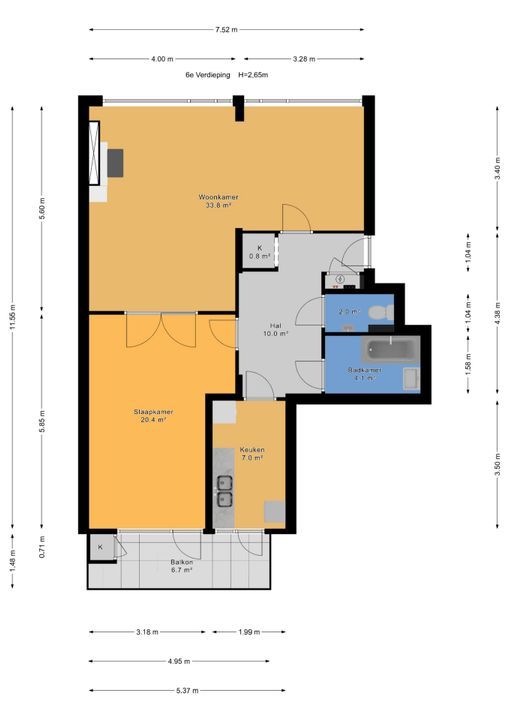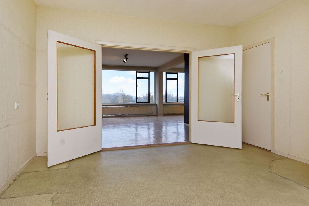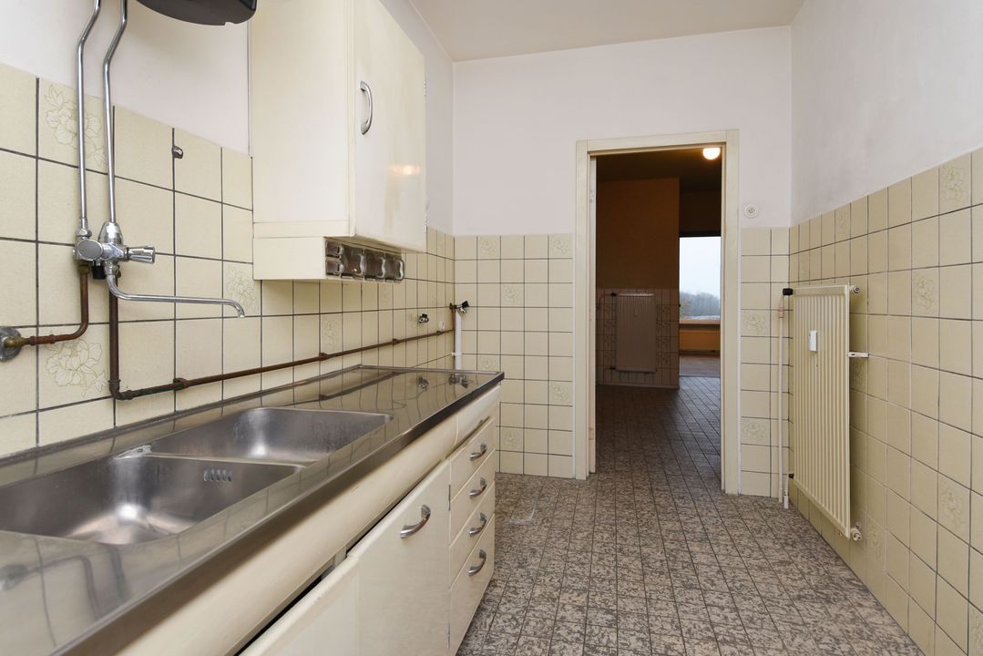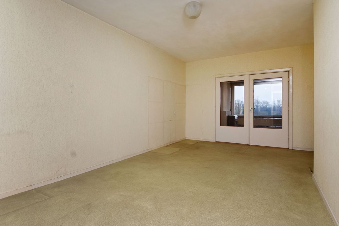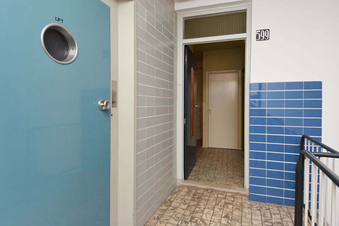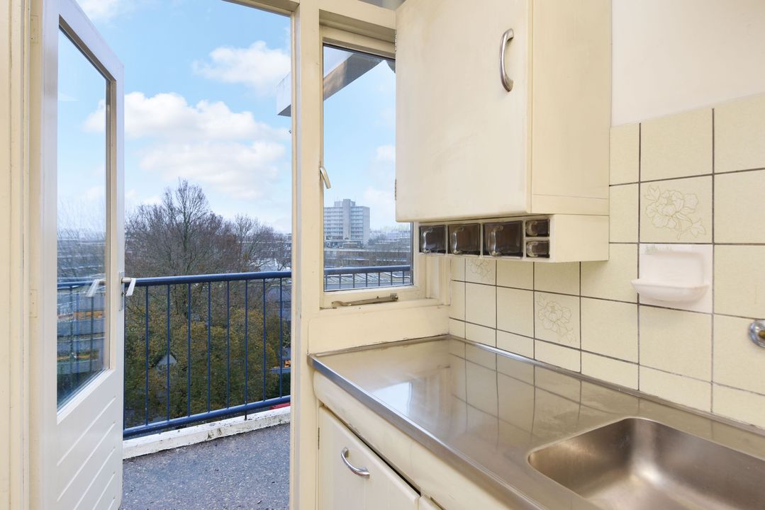 Gesloten centrale entreehal. Lift of trap naar 6e etage, entreehal met meterkast, woon-/eetkamer met bijgetrokken zijkamer en travertin schouw, keuken zonder apparatuur, slaapkamer aan de achterzijde, badkamer met bad/douchecombinatie en wastafel, toilet met fonteintje, balkon over de gehele breedte van de woning met balkonkast.