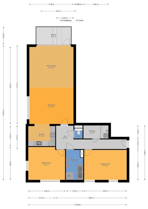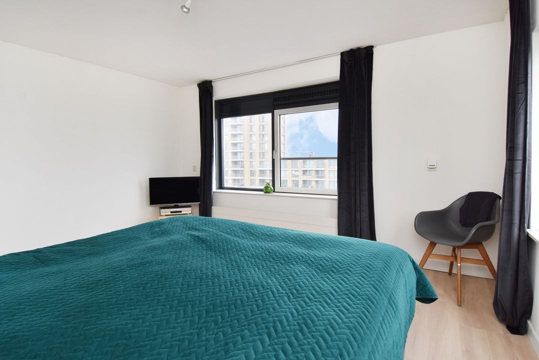 Op de centrale overloop van de 17e woonlaag is er een eigen meterkast, entree van het appartement, gang, inpandige bergruimte met de aansluiting voor de wasmachine, de opstelplaats van de cv-ketel en de box van de mechanische ventilatie, hoofdslaapkamer (voorheen 2), inpandige badkamer met een ligbad, 2 vaste wastafels en een douchecabine, toiletruimte met een wandcloset en een fonteintje, 2e slaapkamer, open keuken met een L-vormig keukenblok voorzien van een 4-pits gaskookplaat, een rvs-afzuigkap (recirculatie), een koel-/vries combinatie, een vaatwasser en een rvs-spoelbak, ruime woonkamer met toegang naar een balkon van ca. 8 m2 gesitueerd op het westen. Op de 6e etage is er via een loopbrug het parkeerdek bereikbaar waar een eigen parkeerplaats aanwezig is. Op de begane grond is er een gemeenschappelijke fietsenstalling en op de 1e woonlaag is er een eigen berging aanwezig.