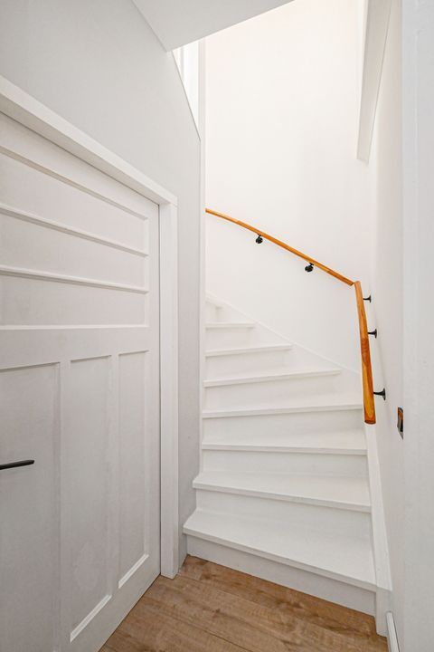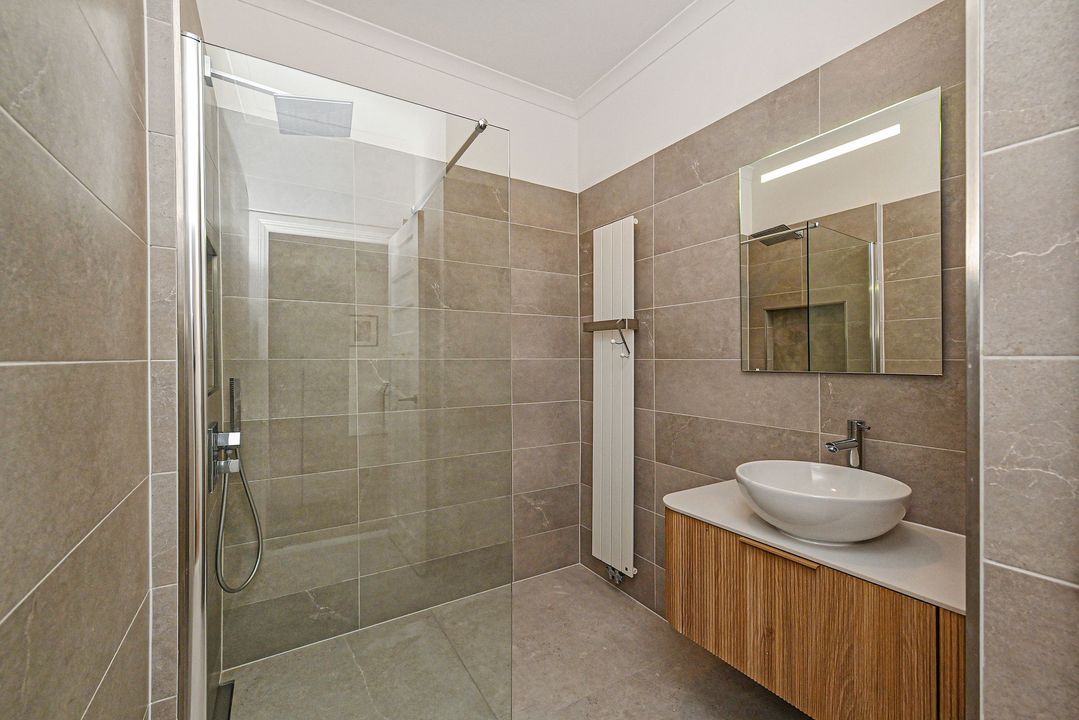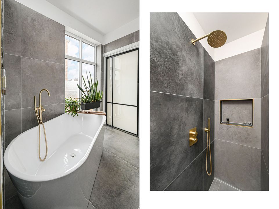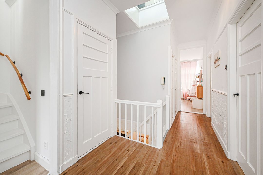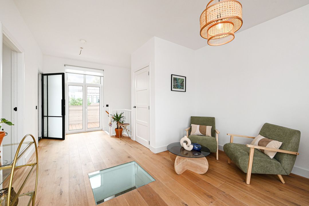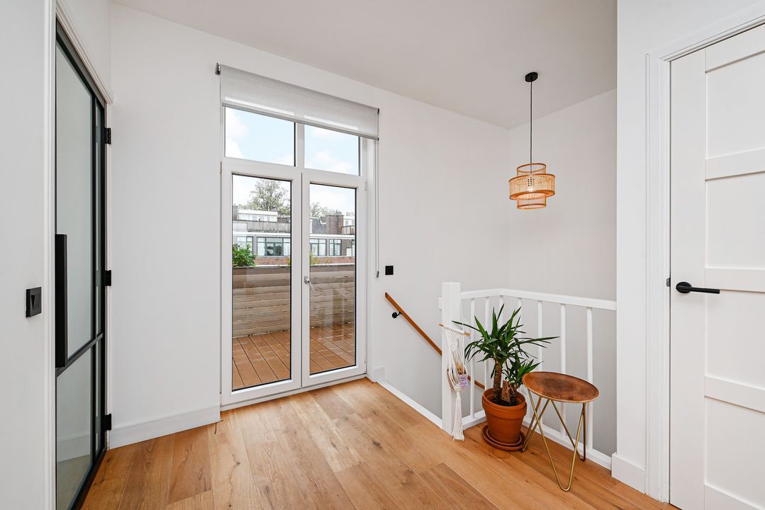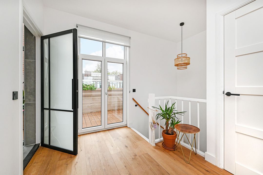 Trap naar de derde etage, riante overloop met een vaste kast waarin de cv-ketel, luxe tweede badkamer met vrijstaand ligbad, inloopdouche, wastafelmeubel en toilet, grote slaapkamer, terras achterzijde en terras voorzijde.
