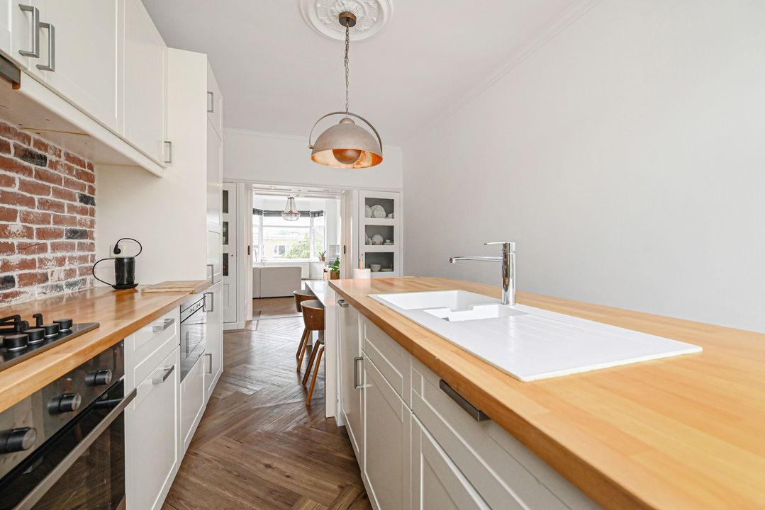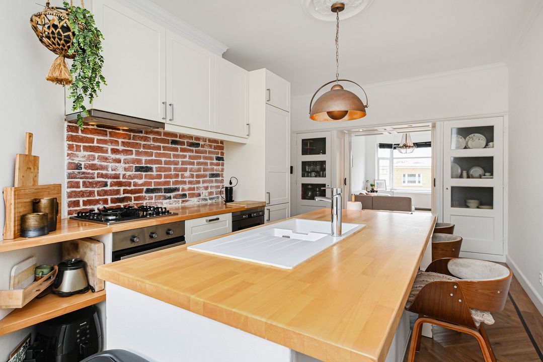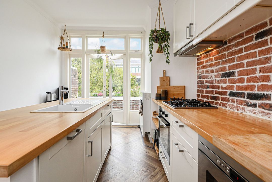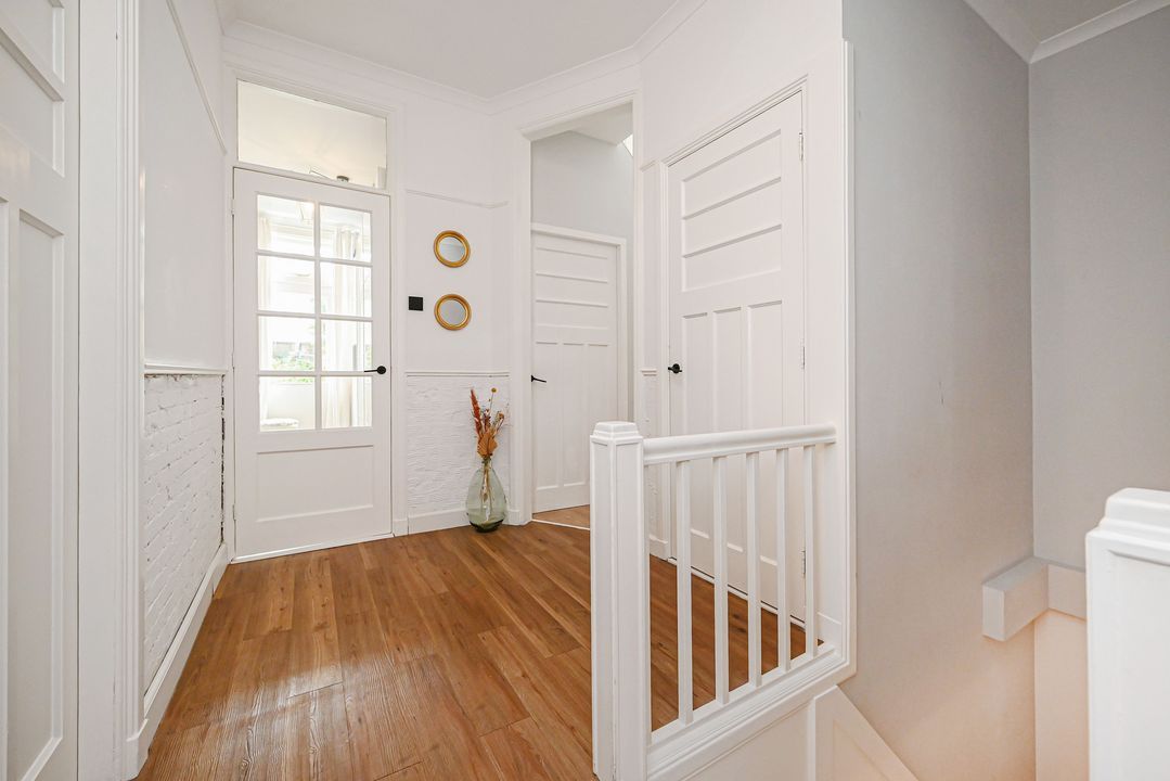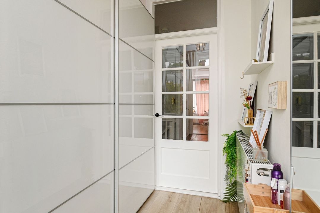 Open portiek met entreehal op de eerste etage met meterkast en binnentrap naar de tweede etage, overloop met vaste kast en toilet met fonteintje, ruime slaapkamer aan de voorzijde, luxe badkamer met inloopdouche en wastafelmeubel, woon-/eetkamer met suiteseparatie, schouw en pvc vloer, open keuken in de achterkamer met 4-pits gaskookplaat, oven, magnetron, koelkast, vriezer en vaatwasser, balkon achterzijde over de gehele breedte met een balkonkast, tussenkamer in de voormalige keuken en achterzijkamer.