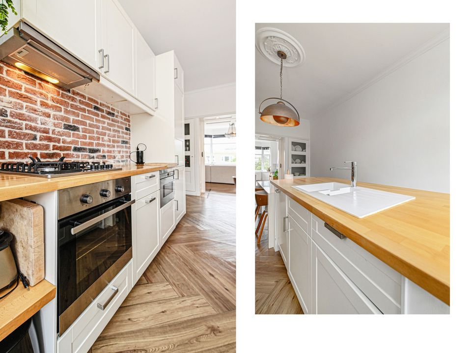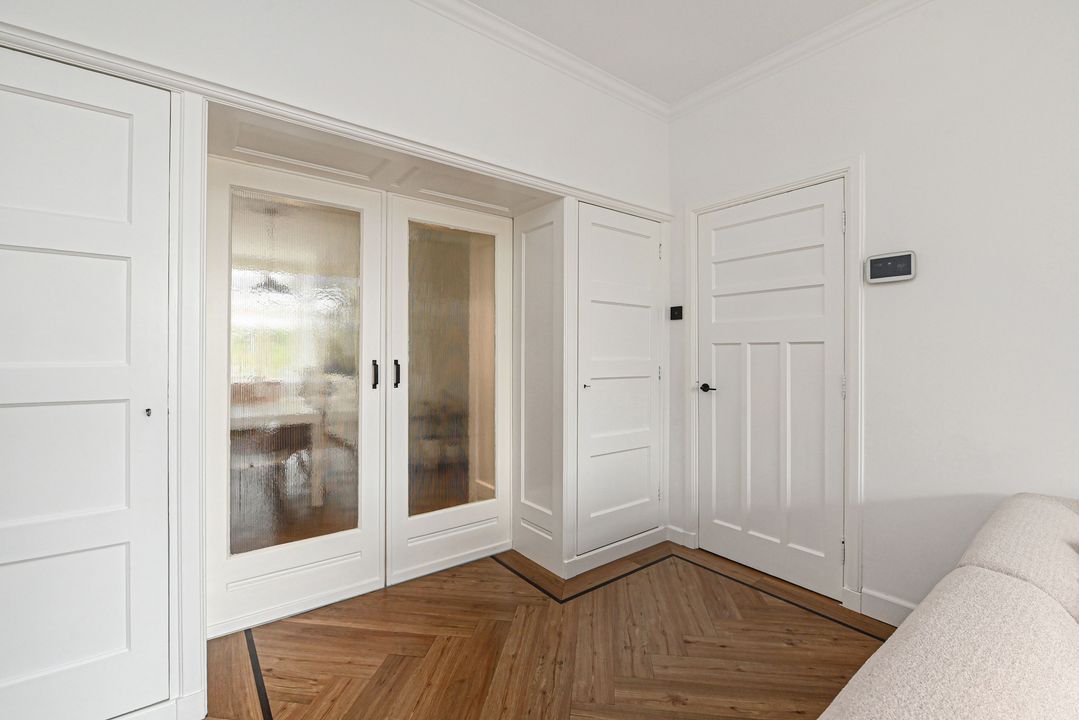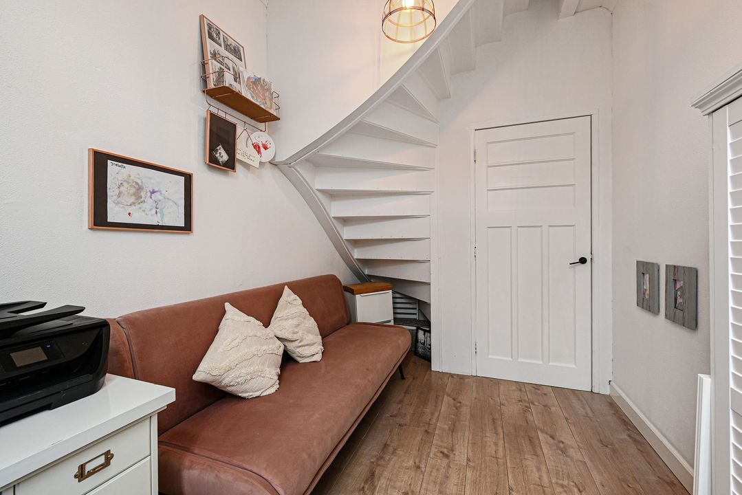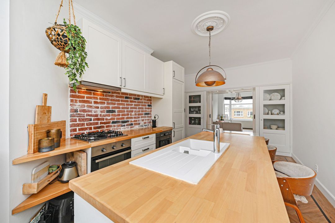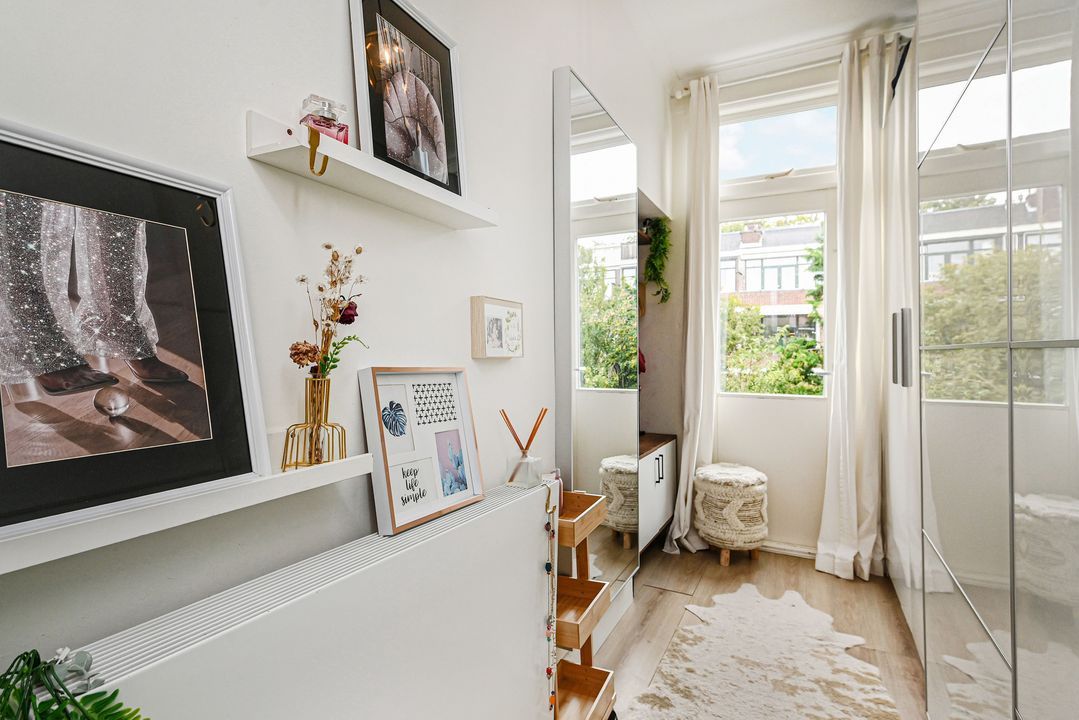 Open portiek met entreehal op de eerste etage met meterkast en binnentrap naar de tweede etage, overloop met vaste kast en toilet met fonteintje, ruime slaapkamer aan de voorzijde, luxe badkamer met inloopdouche en wastafelmeubel, woon-/eetkamer met suiteseparatie, schouw en pvc vloer, open keuken in de achterkamer met 4-pits gaskookplaat, oven, magnetron, koelkast, vriezer en vaatwasser, balkon achterzijde over de gehele breedte met een balkonkast, tussenkamer in de voormalige keuken en achterzijkamer.