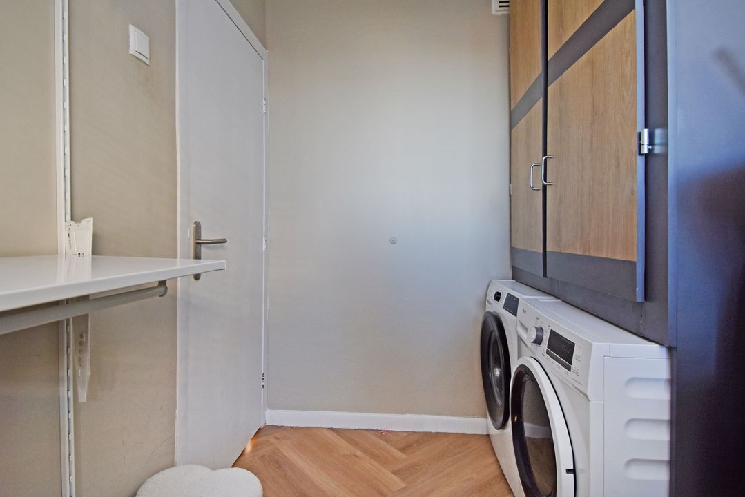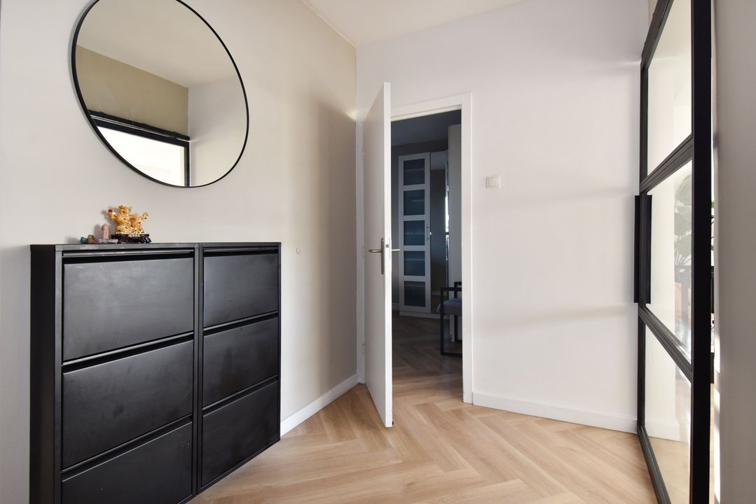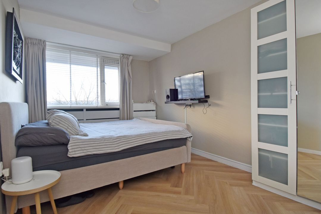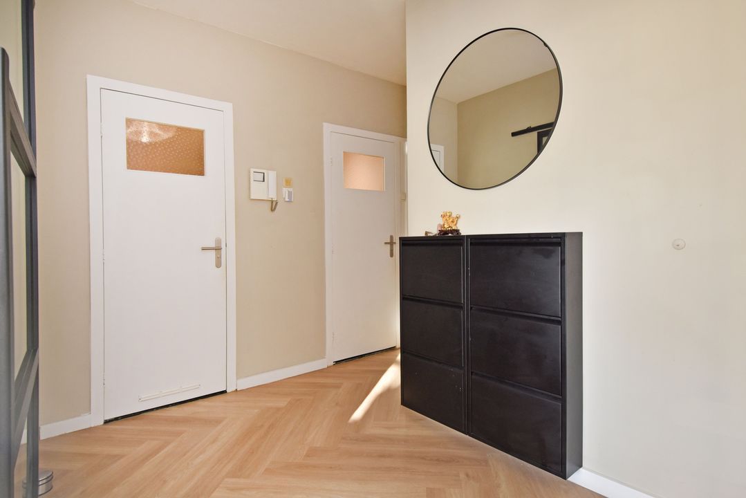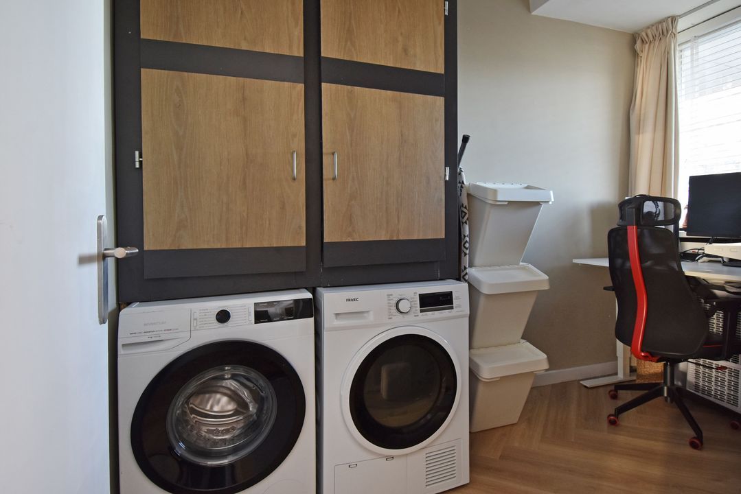 Entree via een gesloten entree, lift naar de 5e etage, entree van het appartement, vaste kast met de meterkast, vestibule, gang met een pvc vloer doorlopend in de woning, slaapkamer aan de voorzijde, 2e kamer aan de voorzijde met een vaste kast met de opstelplaats van de boiler en de aansluiting voor de wasmachine, modern toilet, badkamer met een moderne inrichting voorzien van ligbad en een vaste wastafel met meubel, hoofdslaapkamer met een vaste kast, woon-/ eetkamer met deur naar het balkon, open keuken met een moderne inrichting voorzien van diverse apparatuur waaronder een American fridge (gaat mee), een combi-oven, een inductie kookplaat, een afzuigkap, een vaatwasser en een close in boiler.