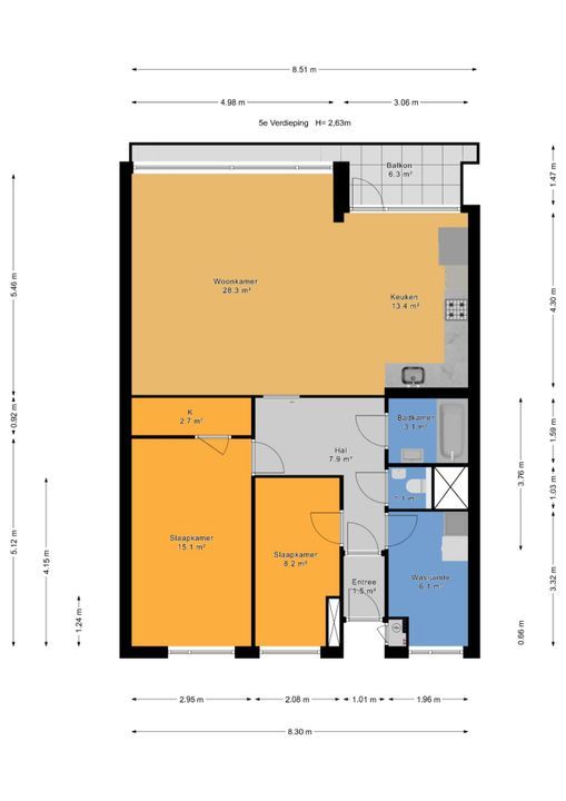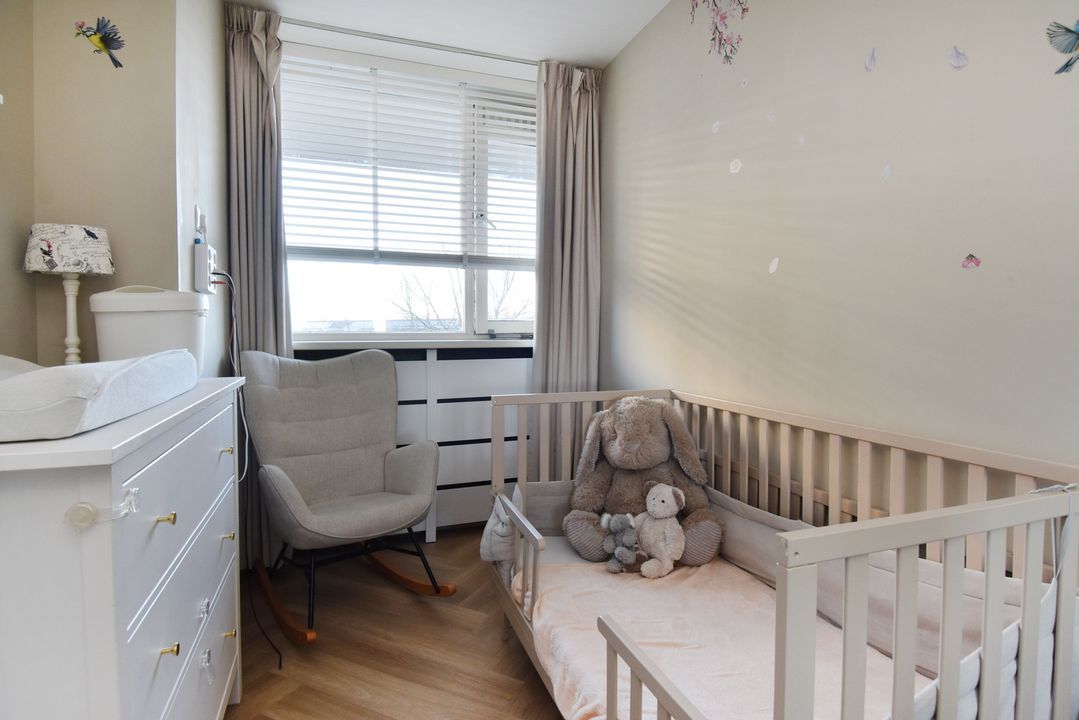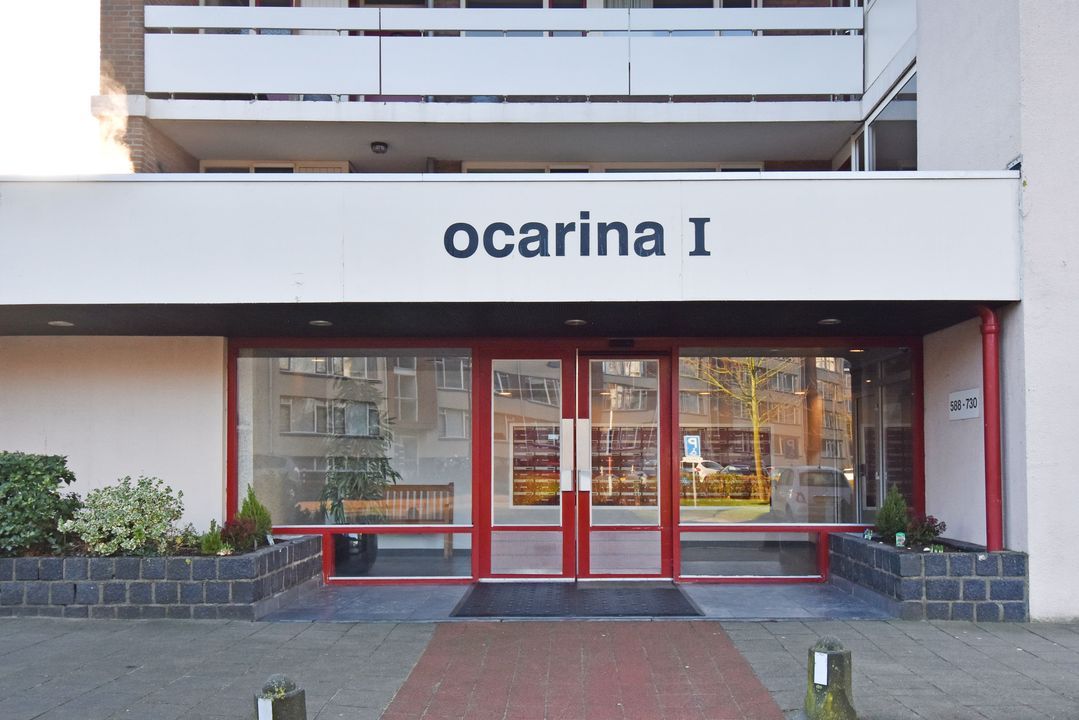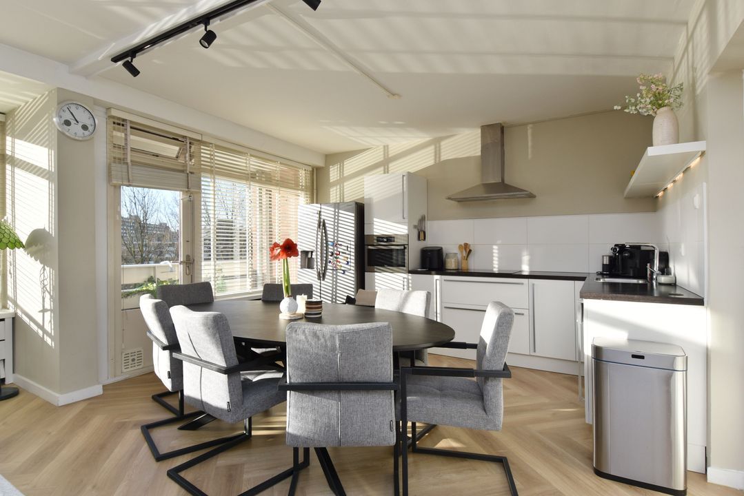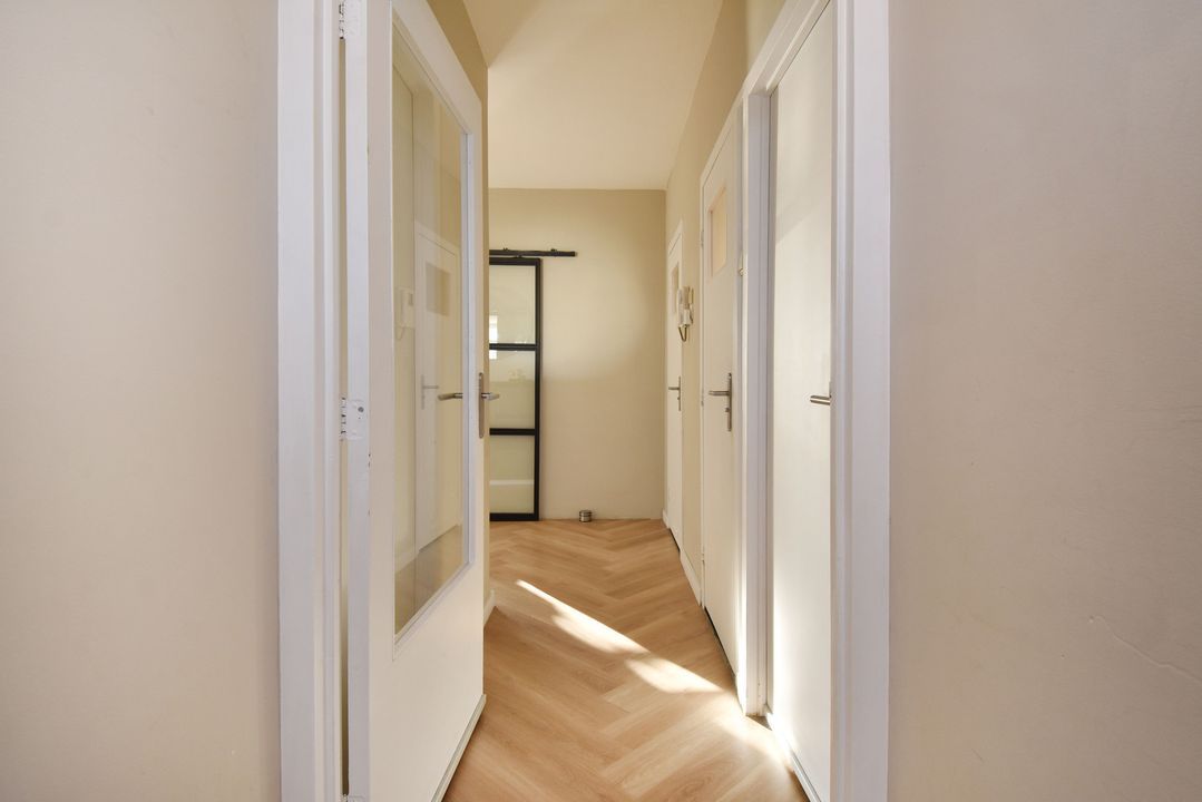 Entree via een gesloten entree, lift naar de 5e etage, entree van het appartement, vaste kast met de meterkast, vestibule, gang met een pvc vloer doorlopend in de woning, slaapkamer aan de voorzijde, 2e kamer aan de voorzijde met een vaste kast met de opstelplaats van de boiler en de aansluiting voor de wasmachine, modern toilet, badkamer met een moderne inrichting voorzien van ligbad en een vaste wastafel met meubel, hoofdslaapkamer met een vaste kast, woon-/ eetkamer met deur naar het balkon, open keuken met een moderne inrichting voorzien van diverse apparatuur waaronder een American fridge (gaat mee), een combi-oven, een inductie kookplaat, een afzuigkap, een vaatwasser en een close in boiler.