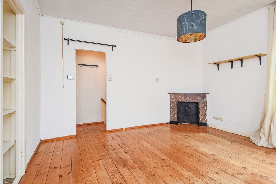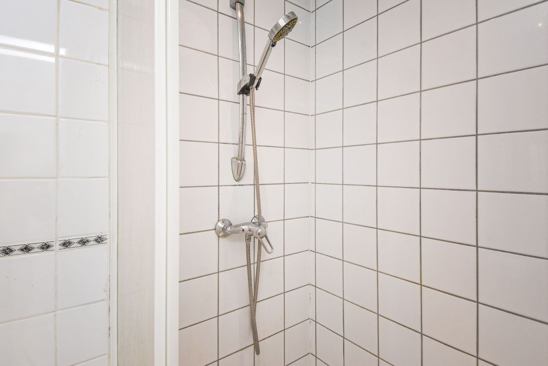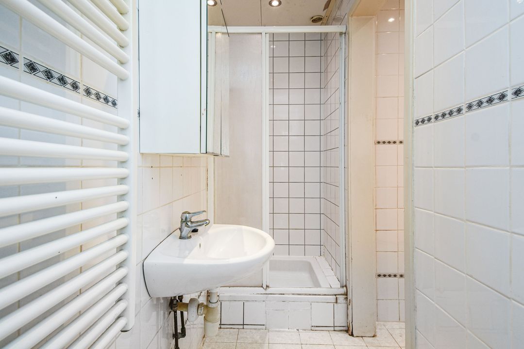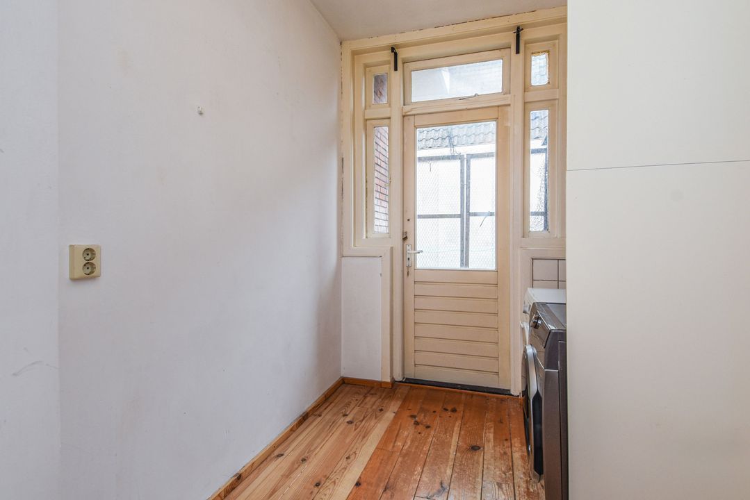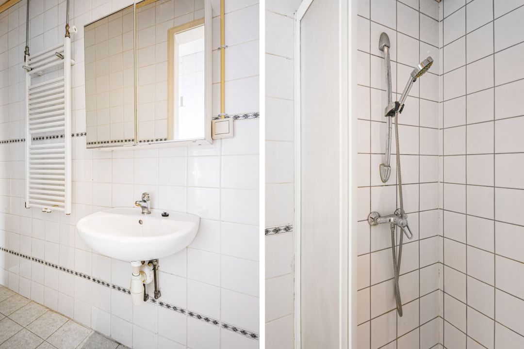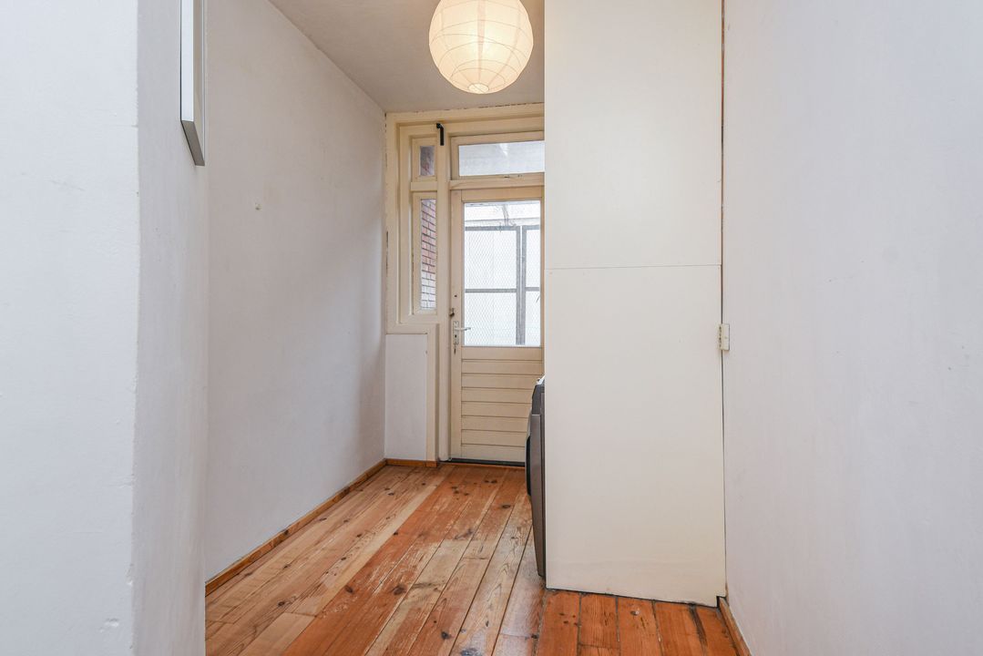 Open portiek met trap naar de eerste etage, entree via hal met meterkast en binnentrap naar de tweede etage, woonkamer met suiteseparatie naar de eetkamer met open keuken voorzien van vaatwasser, gasfornuis en afzuigkap, slaapkamer aan de achterzijde, badkamer met wastafel, douche en toilet, hal naar bijkeuken/wasruimte met cv-ketel en toegang tot beknopt balkon met balkonkast.