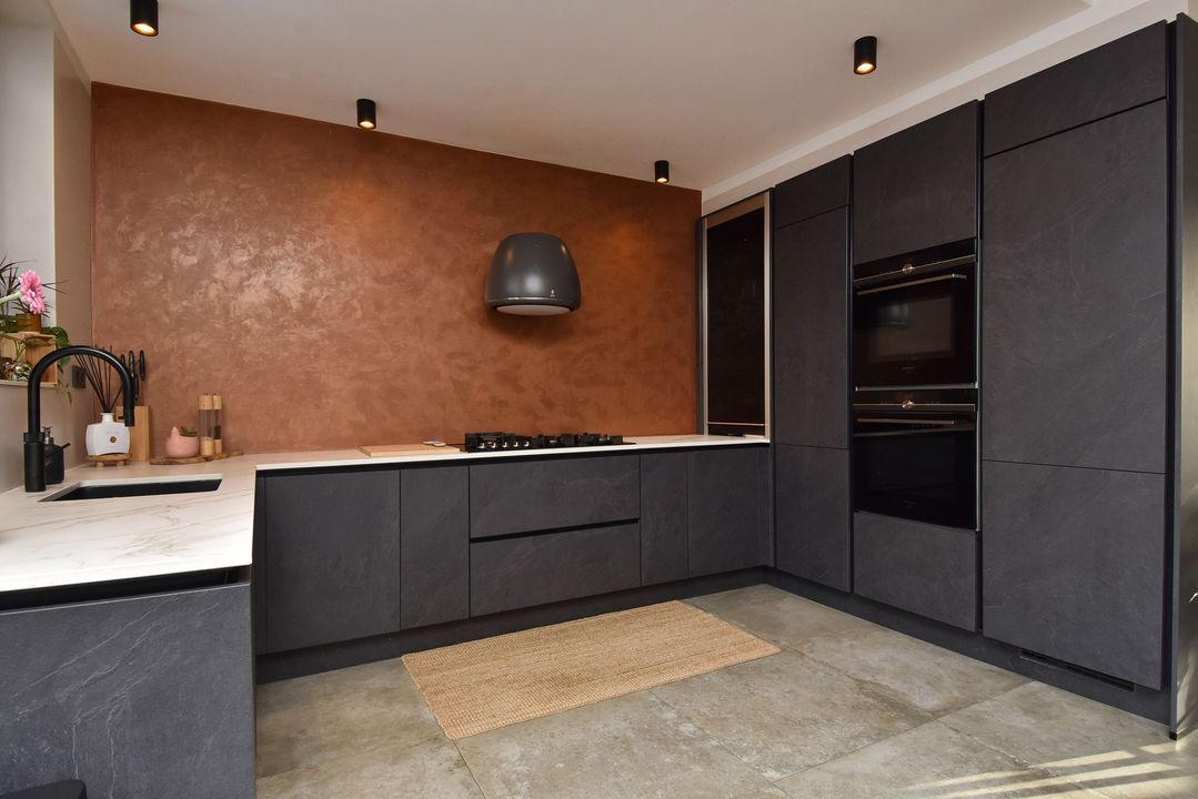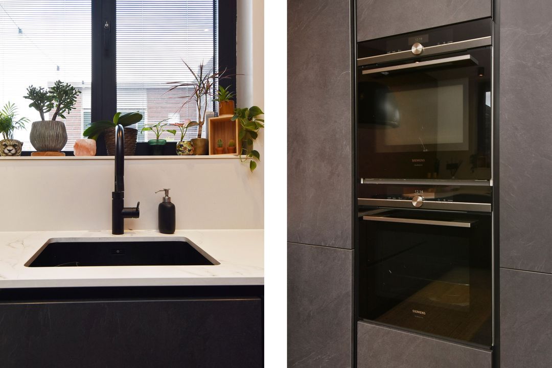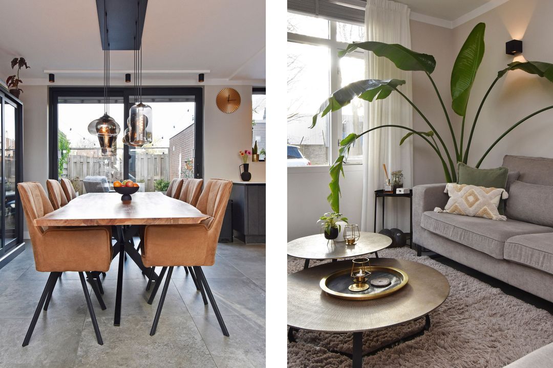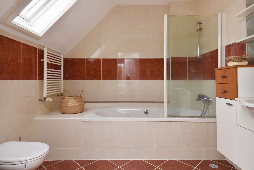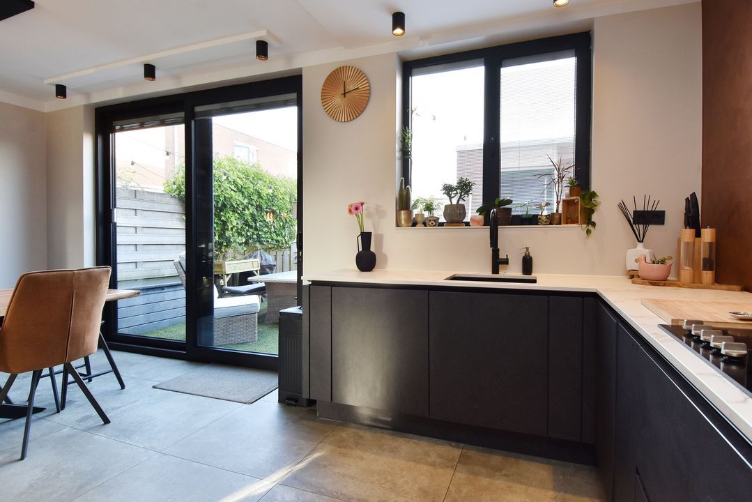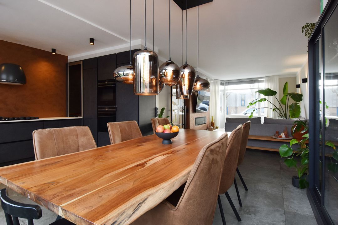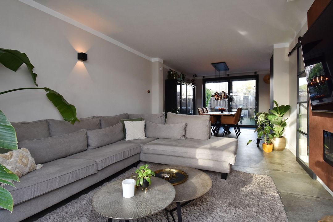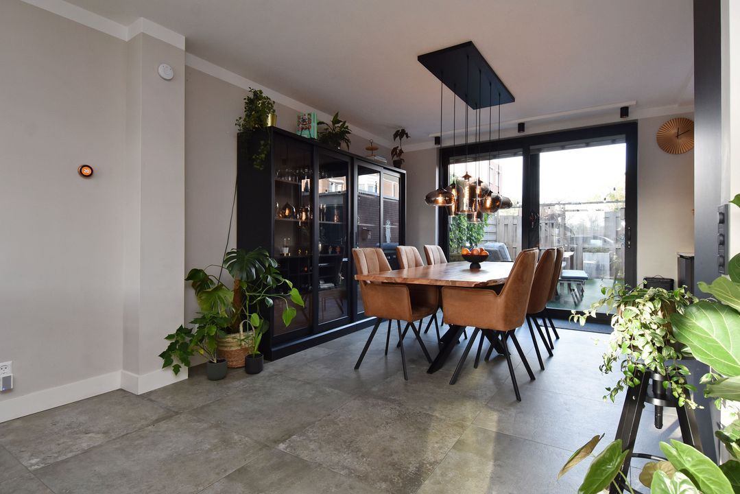 Entrance via the front garden, hallway with tiled floor and underfloor heating, extending into the living/dining room. There is a meter cupboard, a built-in cupboard under the stairs housing the central heating boiler (Remeha), a toilet with a small sink, a spacious living/dining room with sliding doors leading to the back garden with a storage room and rear access. The open-plan kitchen is luxuriously modern and equipped with various appliances, including a hob, designer extractor hood, dishwasher, double oven (one of the ovens is also a microwave), large refrigerator, Quooker, and a Dekton stone worktop. Stairs to the first floor. Landing with laminate flooring extending into the bedrooms. Spacious front and rear bedrooms, a side room at the rear, a room with connections for the washing machine and dryer, and a bathroom with modern, luxurious furnishings, including a bathtub, walk-in shower, toilet, and a large vanity unit. Stairs to the second floor: a very spacious fourth bedroom with air conditioning. The second bathroom has a bathtub, toilet, and vanity unit.