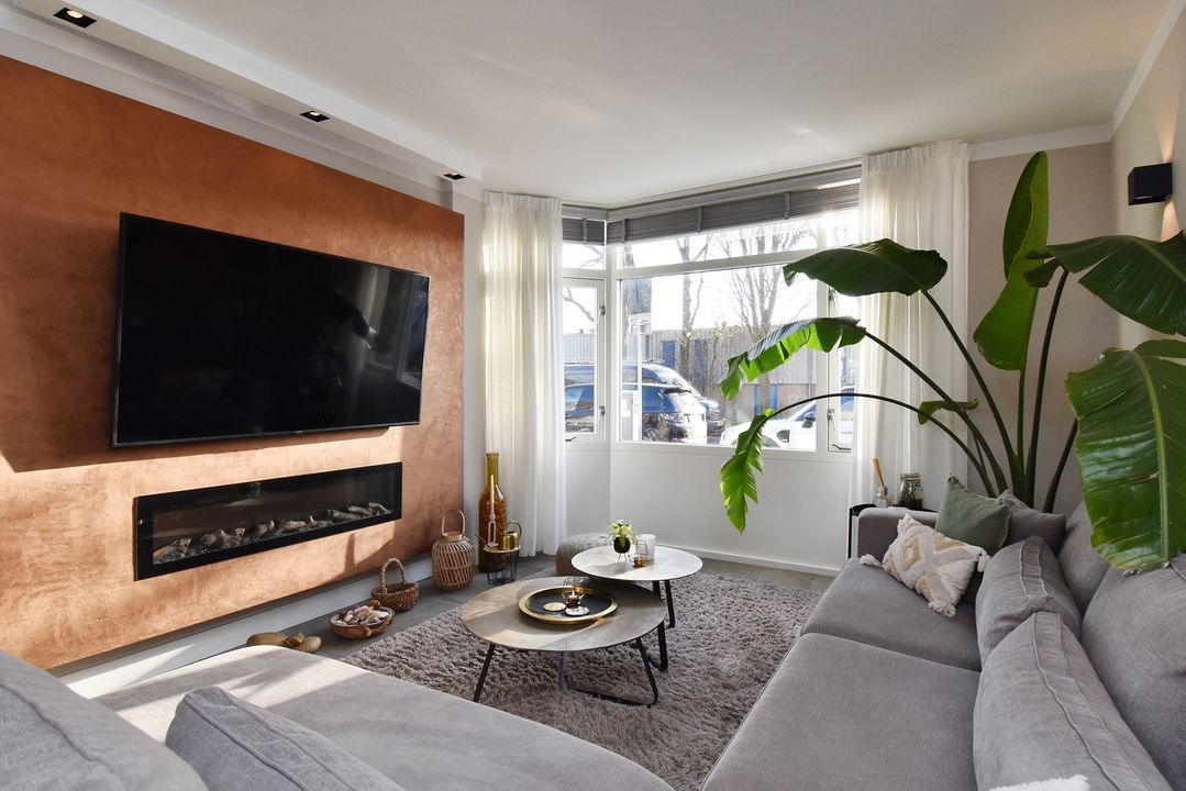 Entree via de voortuin, gang met een plavuizen vloer met vloerverwarming doorlopend in de woon-/ eetkamer, meterkast, vaste kast onder de trap met de opstelplaats van de cv-combiketel (Remeha), toilet met een fonteintje, ruime woon-/ eetkamer met een schuifpui naar de achtertuin met een berging en een achterom, open keuken met een luxe moderne inrichting voorzien van diverse apparatuur waaronder een kookplaat, een designafzuigkap, een vaatwasser, een dubbele oven (waarvan 1 een combimagnetron), een grote koelkast, een Quooker en een hardstenen Dekton werkblad, trap naar de 1e etage, overloop met een laminaatvloer doorlopend in de kamers, ruime voor- en achter slaapkamer, achterzij kamer, kamer met de aansluiting voor onder meer de wasmachine en de wasdroger, badkamer met een moderne luxe inrichting voorzien van een ligbad, een inloopdouche, toilet en een grote vaste wastafel met meubel, trap naar de 2e etage, zeer ruime 4e slaapkamer met een airco, 2e badkamer met een ligbad, een toilet en een vaste wastafel met meubel.