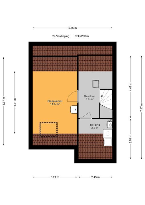 Ruime overloop met bergruimte voorzien van de opstelplaats van de cv-ketel en de aansluiting van de wasmachine. In het trapgat is de box van de mechanische ventilatie en een uitzetraam in het achterdakvlak, slaapkamer met een vaste wastafel en een kantelraam in het voordakvlak.
