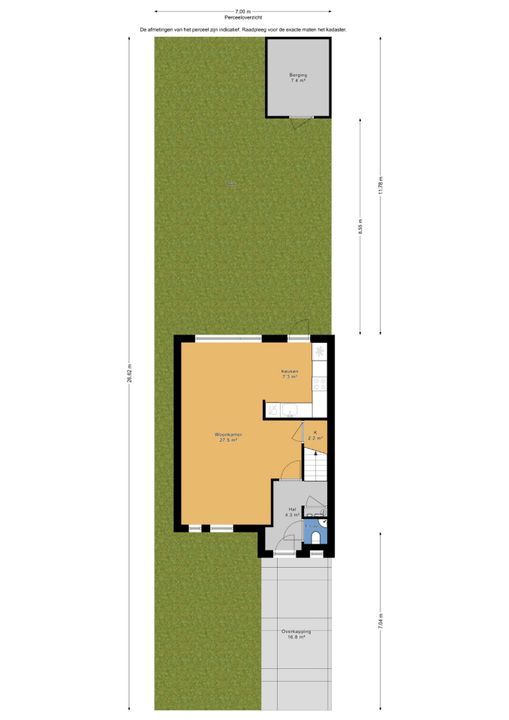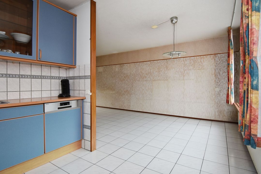 Front garden and carport for parking a car, entrance of the house, hallway, toilet room with a wall closet and a sink, meter cupboard, spacious living room with a stair cupboard and an open kitchen located at the rear with an L-shaped kitchen unit with a stainless steel gas hob, a stainless steel front oven, a fridge freezer, a dishwasher, a stainless steel sink and access to the backyard. There is a water connection on both the front and rear façade. The garden has green borders and a lawn, a stone shed and a side entrance.