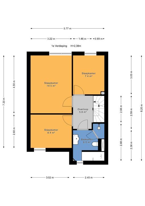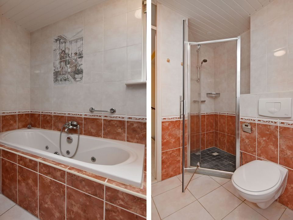 Overloop, badkamer met een douchecabine, een whirlpool ligbad, een designradiator en een vaste wastafel met meubel, voorslaapkamer, hoofdslaapkamer aan de achterzijde en de 3e slaapkamer eveneens aan de achterzijde.