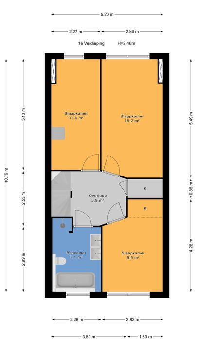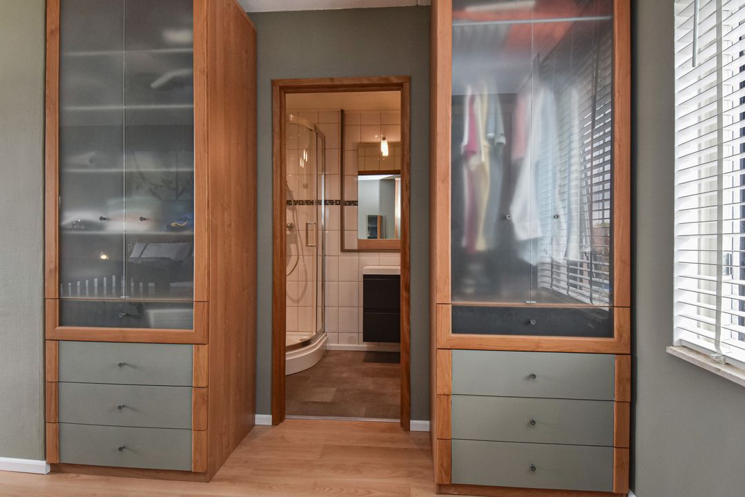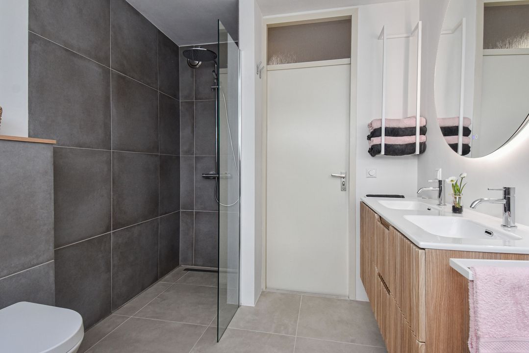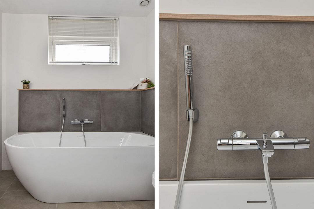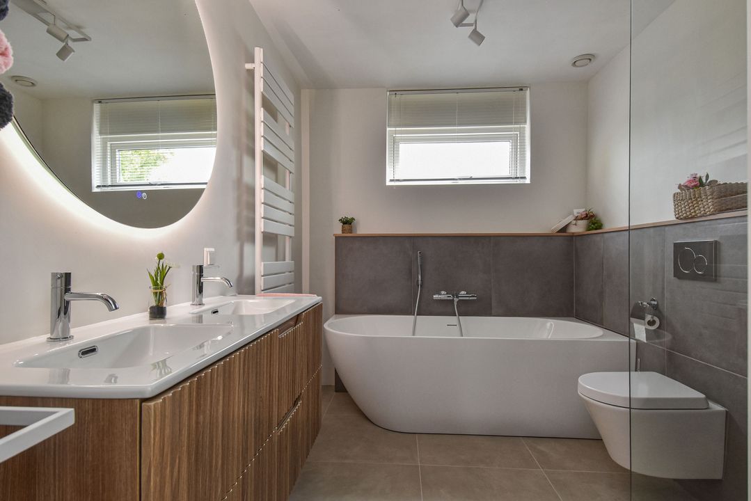 Overloop, vaste kast, achterzijslaapkamer, achterslaapkamer, voorslaapkamer met een vaste kast, een in 2025 vernieuwde badkamer met een vrijstaand ligbad, een inloopdouche, een wandcloset een dubbele vaste wastafel met fraai meubel.