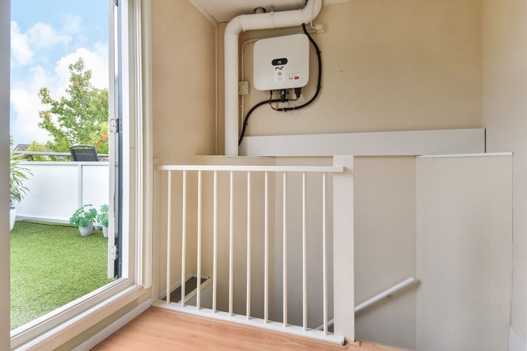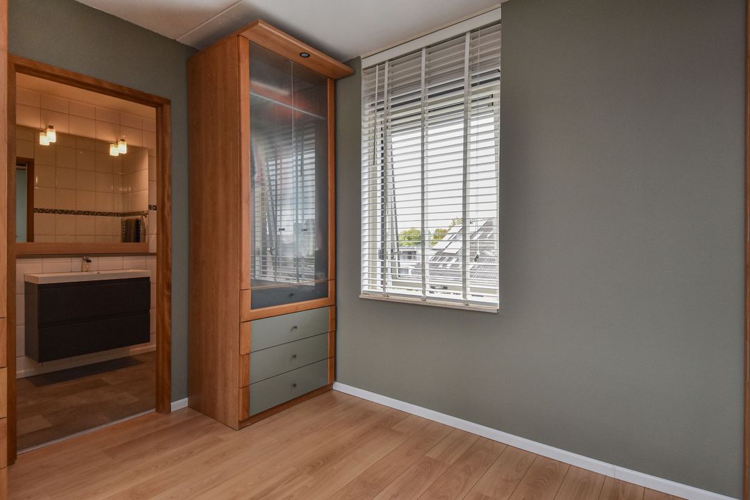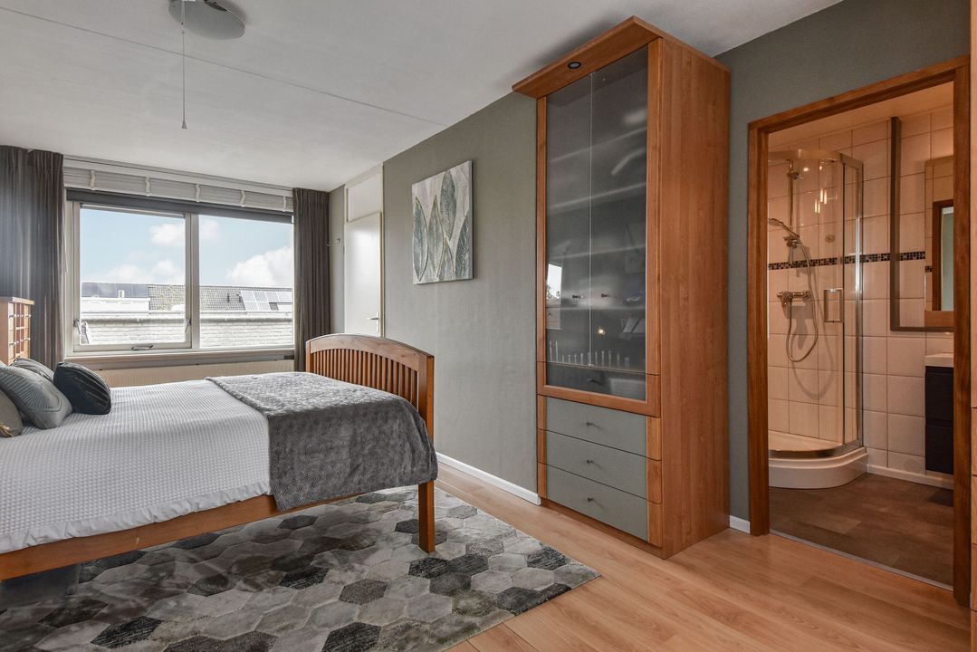 Overloop met de omvormer van de zonnepanelen, vaste kast met de aansluiting voor de wasmachine en de opstelplaats van de cv-ketel, toegang naar het terras van ca. 17 m2, slaapkamer met toegang naar de badkamer en suite met een toilet, een douchecabine, een vaste wastafel met meubel en een designradiator.