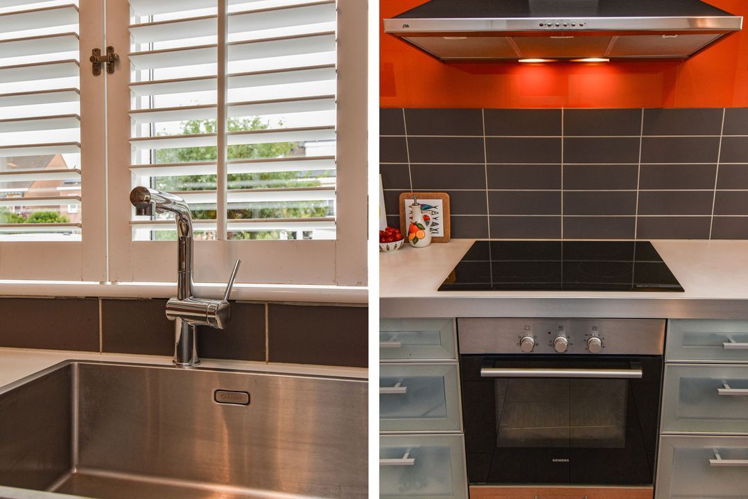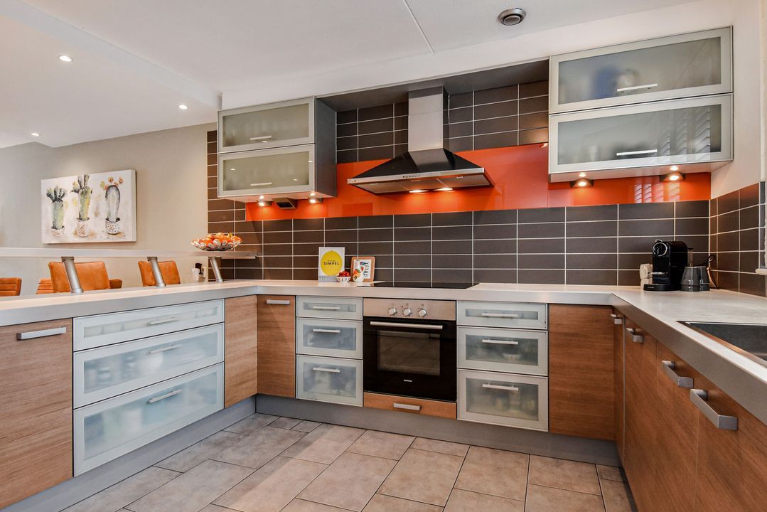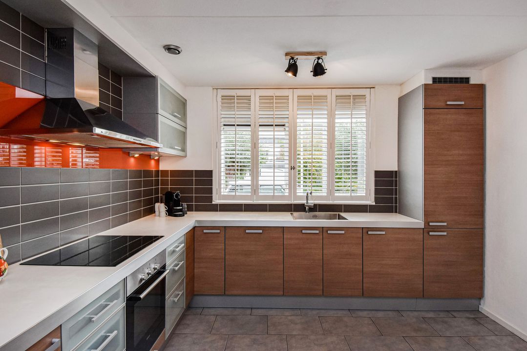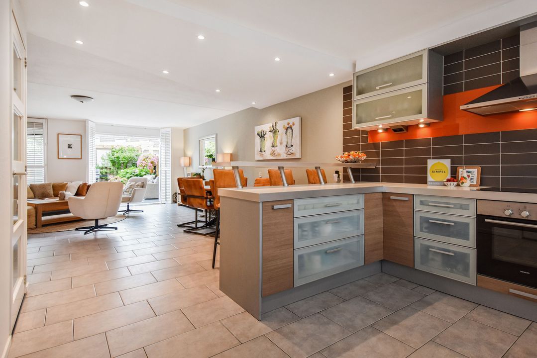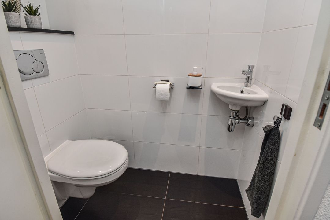 Front garden, entrance of the house, hallway, toilet room with a wall-mounted toilet and small sink, meter cupboard, an open kitchen located at the front with a U-shaped kitchen unit and equipped with a stainless steel sink, a close-in boiler, a fridge freezer, an induction hob, an RSV extractor hood, a stainless steel front oven, a dishwasher and a breakfast bar, living room with a stair cupboard and access to the backyard located on the southwest. The garden is well maintained and equipped with decorative tiles and green borders as well as a stone shed with electricity and access to a back entrance. On the rear façade of the house there is a water connection and an electrically operated awning.