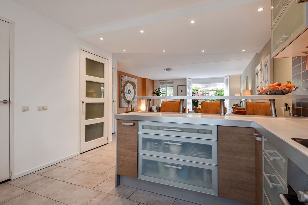 Voortuin, entree van de woning, gang, toiletruimte met een wandcloset en een fonteintje, meterkast, een aan de voorzijde gesitueerde open keuken voorzien van een U-vormig keukenblok en uitgevoerd met een rvs-spoelbak, een close-in boiler, een koel-/vries combinatie, een inductie kookplaat, een rsv-afzuigkap, een rvs-front oven, een vaatwasser en een eetbar, woonkamer met een trapkast en toegang naar de achtertuin gesitueerd op het zuidwesten. De tuin is goed verzorgd en voorzien van siertegels en groenborders alsmede een stenen schuur voorzien van elektra en toegang naar een achterom. Op de achtergevel van de woning is er een wateraansluiting aanwezig en een elektrisch bedienbaar zonnescherm.