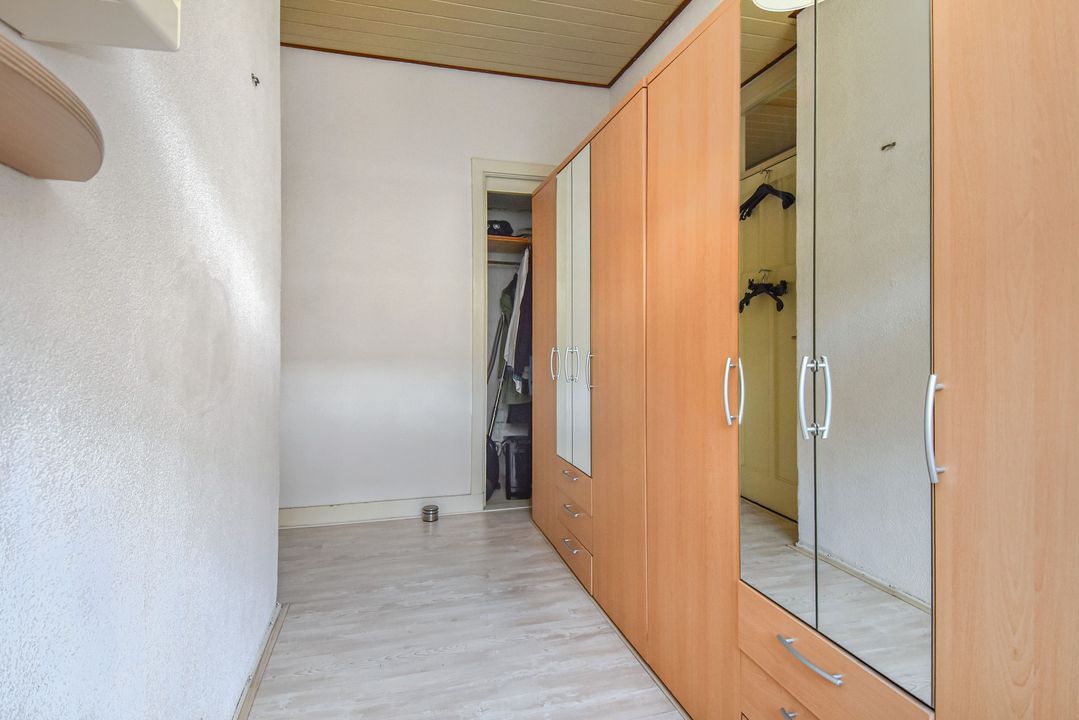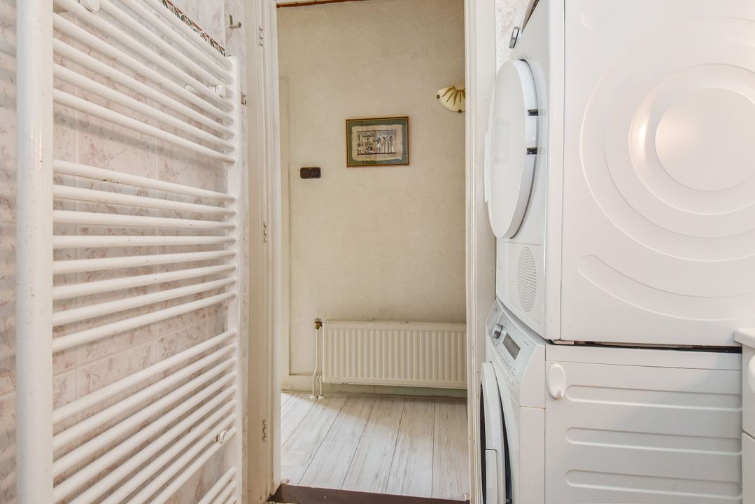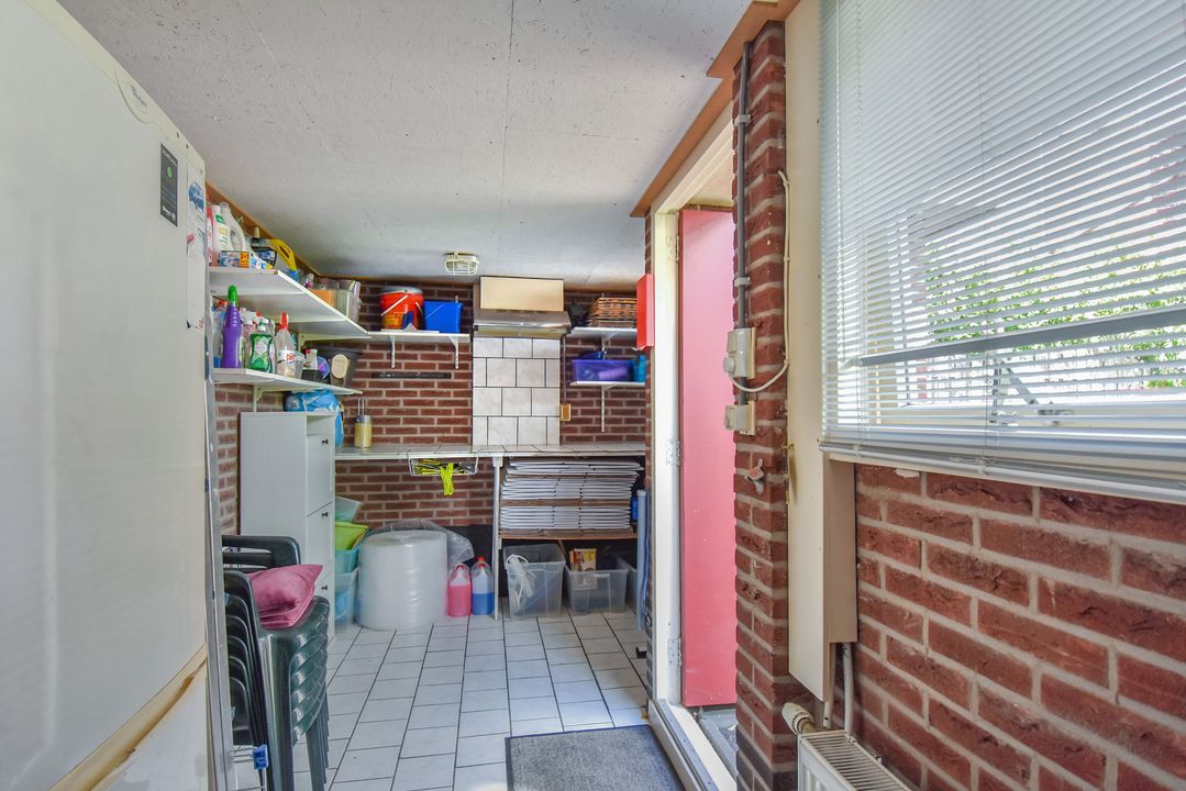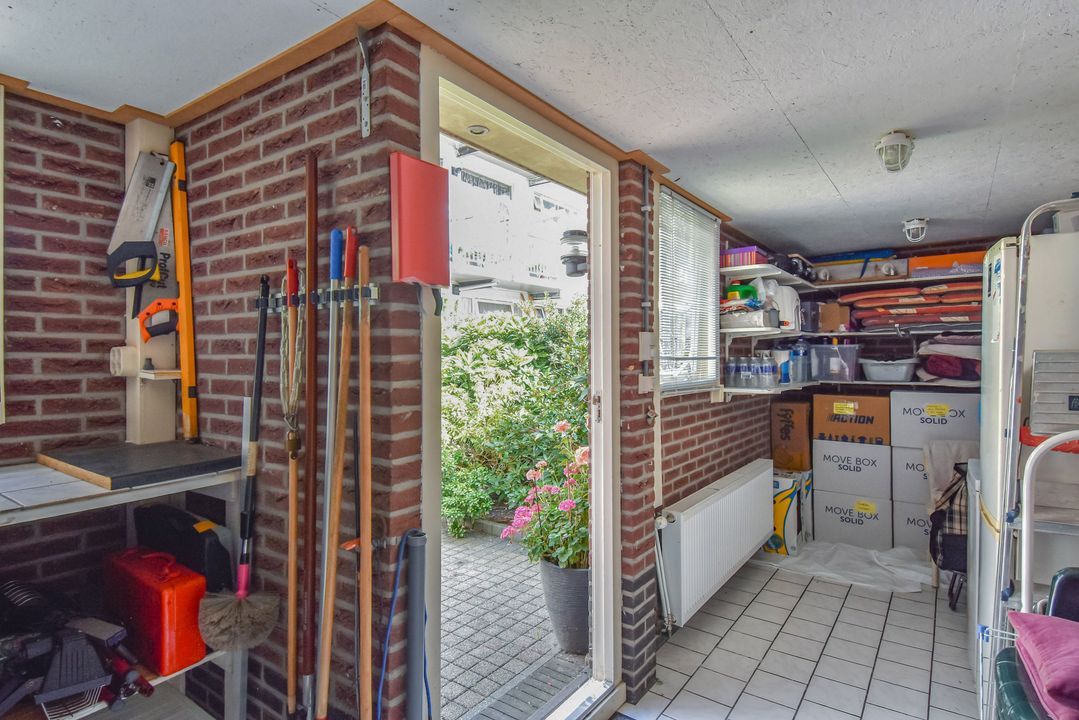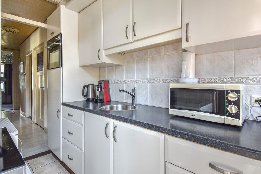 Open portiek met entree op de begane grond, hal met diepe vaste kast en tochtdeur naar de gang, woonkamer in L-vorm, badkamer met douchecabine, wastafelmeubel en wasmachineaansluiting, separaat toilet, slaapkamer aan de achterzijde met vaste kastenwand, tweede slaapkamer met vaste kast waarin de groepenkast, nette keuken met inductiekookplaat, koelkast en combimagnetron, riante grotendeels betegelde achtertuin op het zuidwesten met een grote (13m2!) gemetselde berging voorzien van elektra en verwarming.