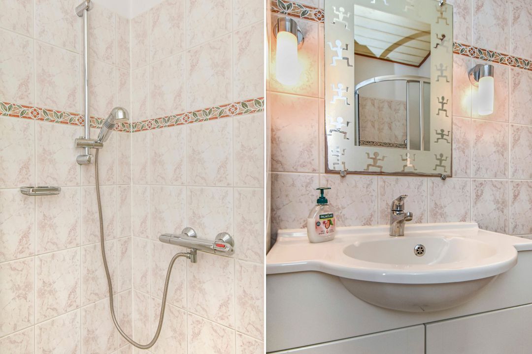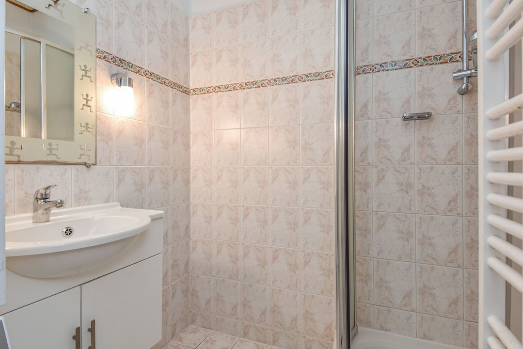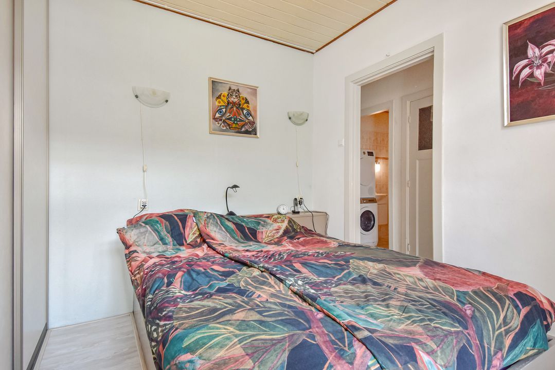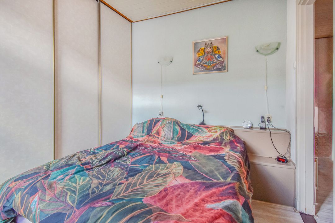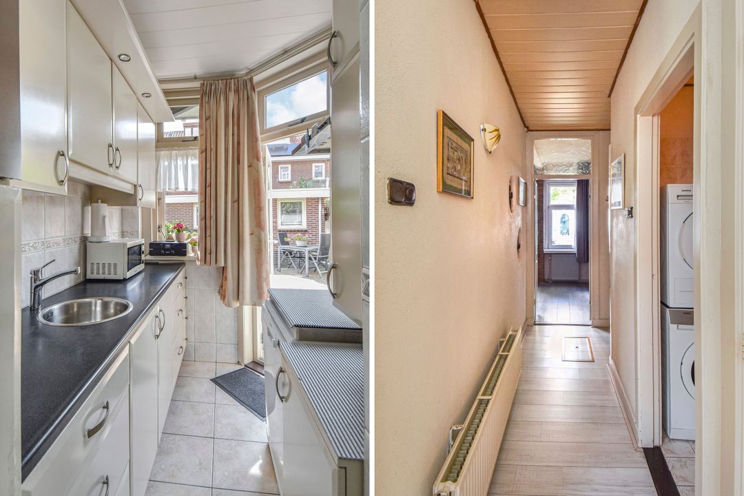 Open portiek met entree op de begane grond, hal met diepe vaste kast en tochtdeur naar de gang, woonkamer in L-vorm, badkamer met douchecabine, wastafelmeubel en wasmachineaansluiting, separaat toilet, slaapkamer aan de achterzijde met vaste kastenwand, tweede slaapkamer met vaste kast waarin de groepenkast, nette keuken met inductiekookplaat, koelkast en combimagnetron, riante grotendeels betegelde achtertuin op het zuidwesten met een grote (13m2!) gemetselde berging voorzien van elektra en verwarming.